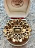 Чешская брошь с основой из латуни с позолотой и вставок из цветного стекла и стекла с покрытием AB. На нескольких вставках есть небольшие скольчики (учтено в цене). Размер броши 5х4см.