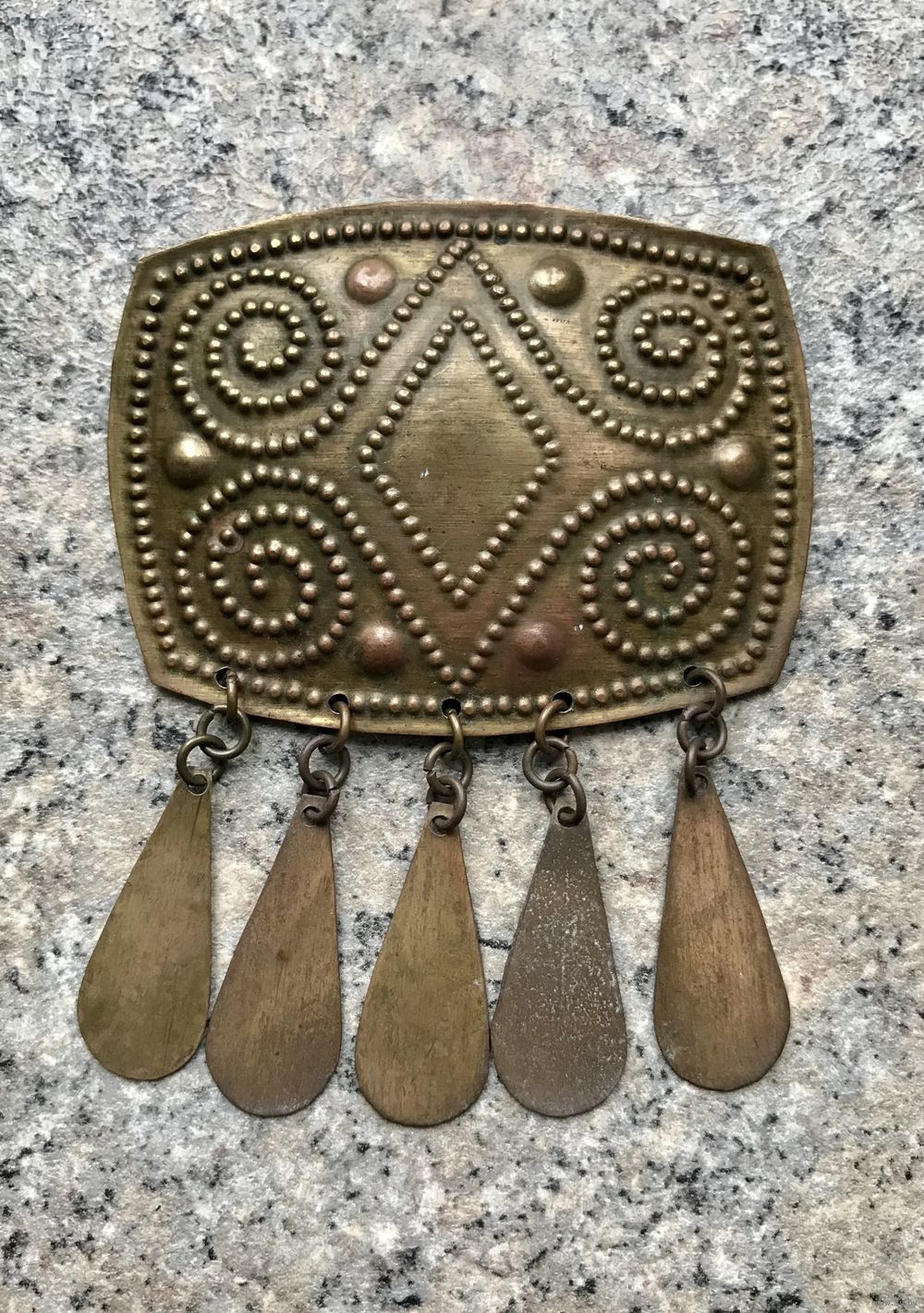 Винтажная брутальная брошь из латуни, Прибалтика 60-70-ее гг. Высота с висюльками 8,5см., ширина 7см. Состояние хорошее.