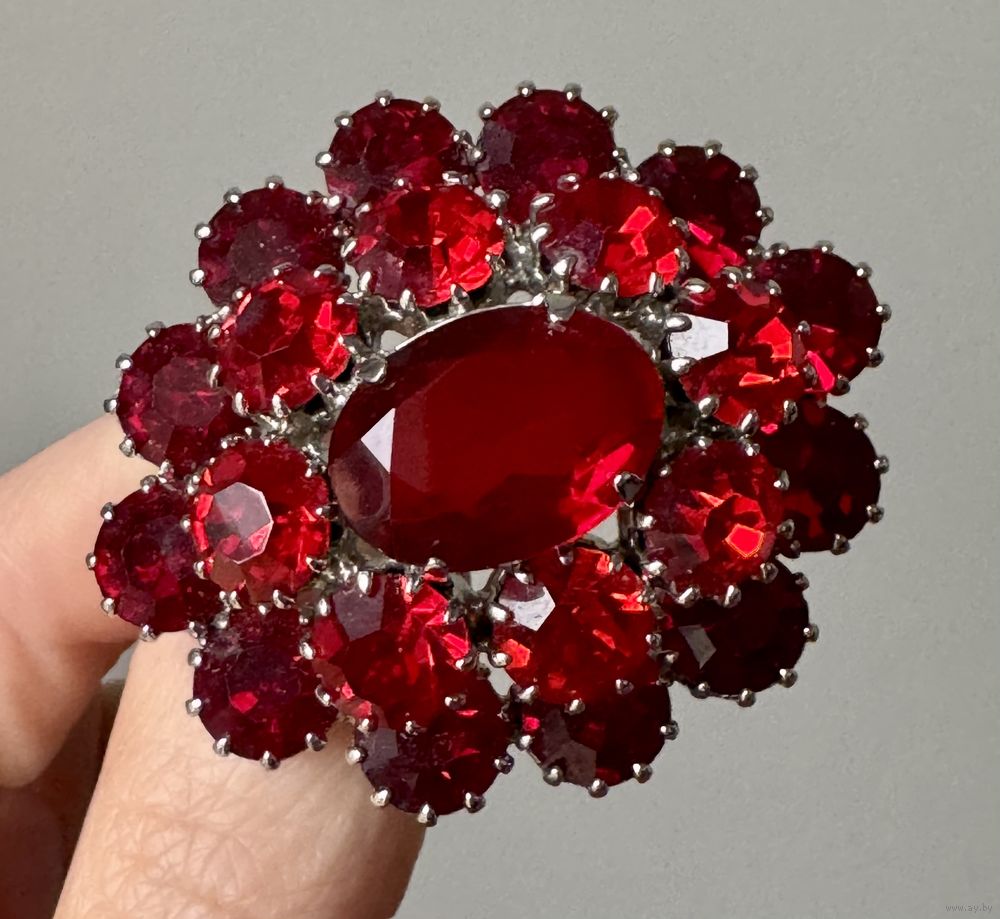 Крупная винтажная чешская трехуровневая брошь с основой из латуни с серебрением, вставки из стекла рубинового цвета. Размер 4,5х4см., высота 1,5см. Состояние хорошее.