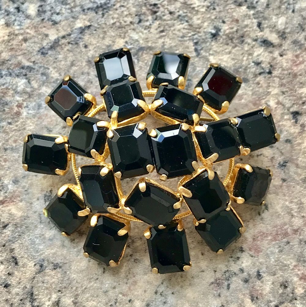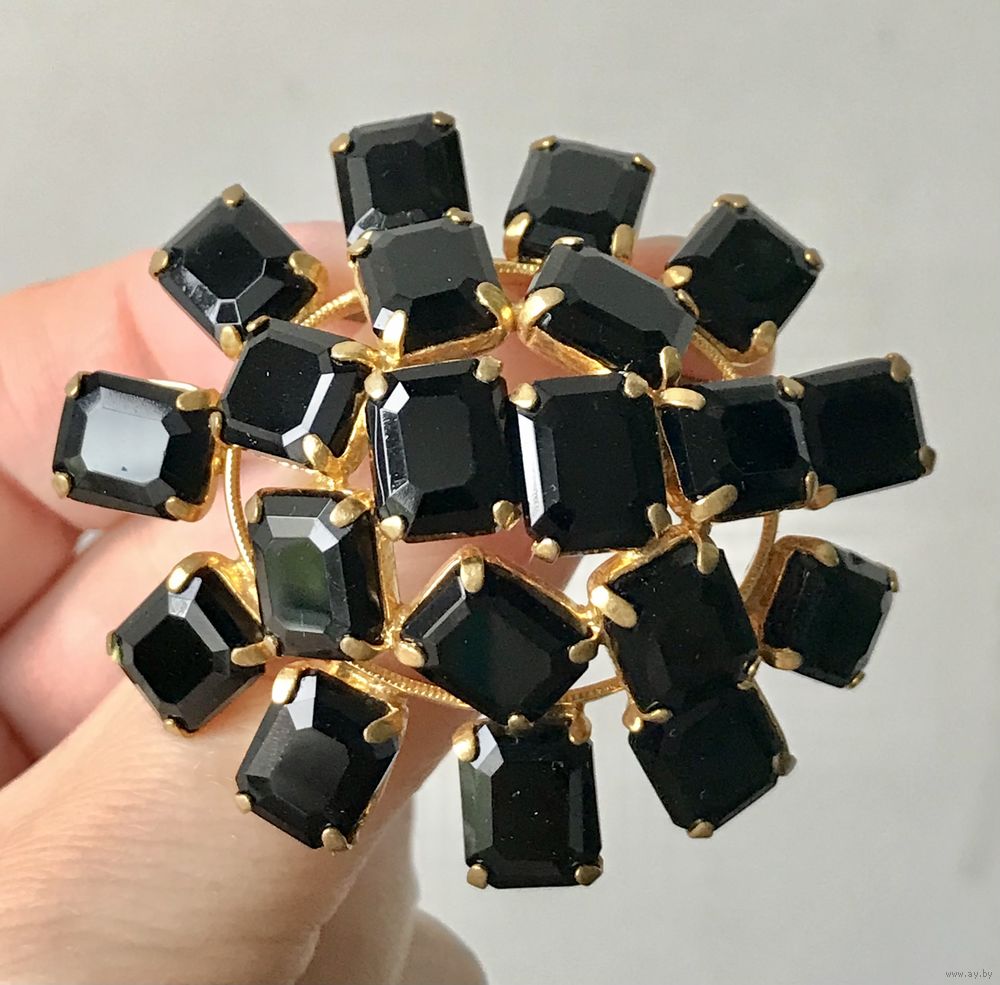 Крупная чешская купольная брошь с основой из латуни и вставками из чёрного стекла. Размер броши 5,2х4,6см., размер вставок 1х0,8см. Состояние хорошее.