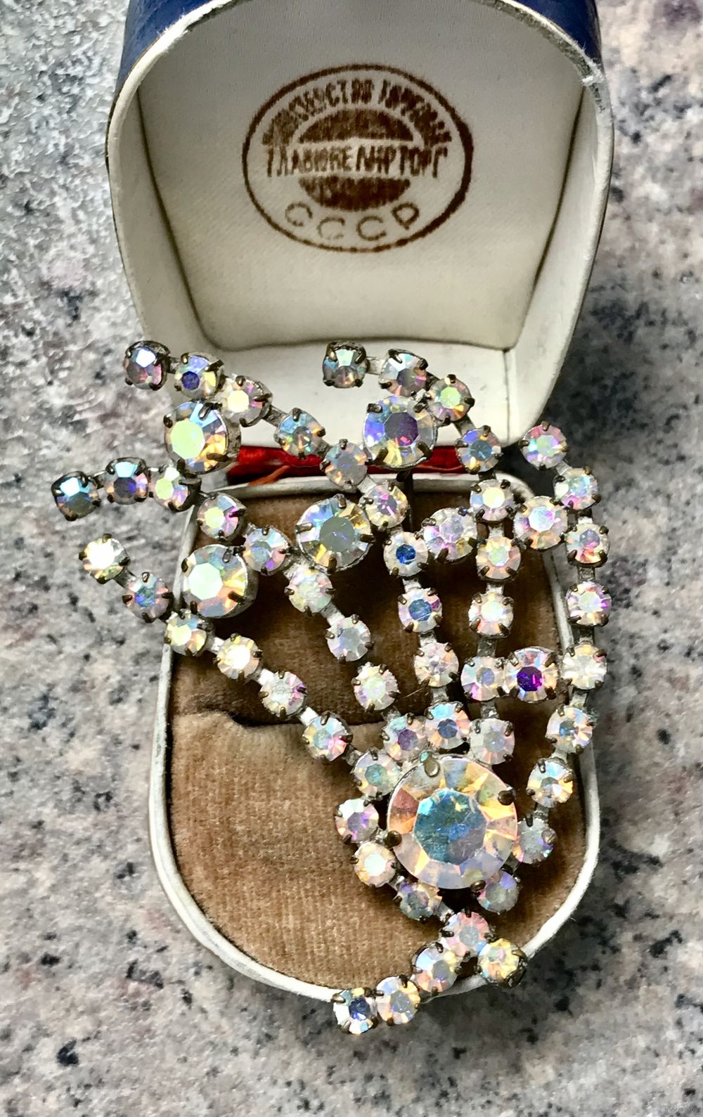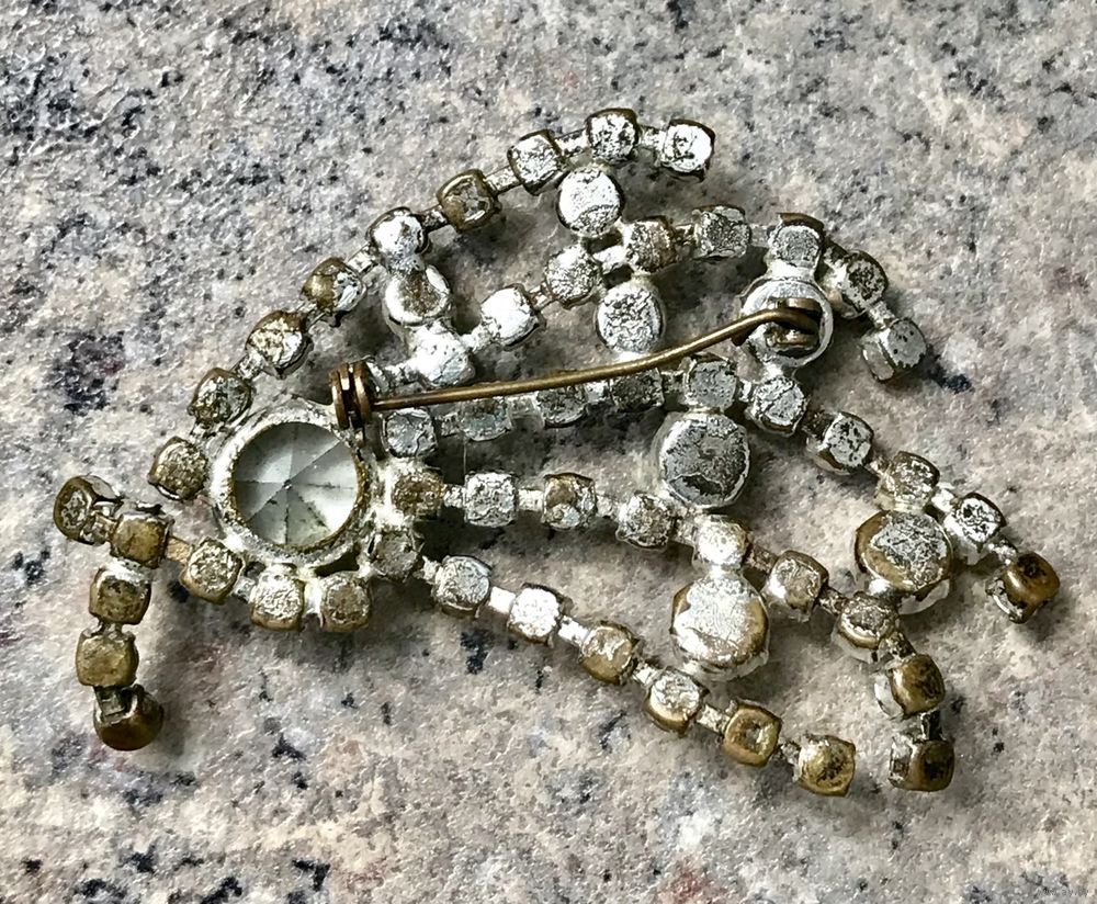 Крупная брошь с основой из латуни с серебрением и вставок из стекла с покрытием AB. С обратной стороны на металле имеются потёртости покрытия. Размер броши 6,5х5см.