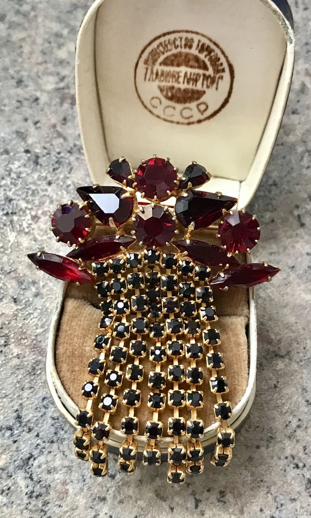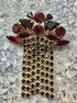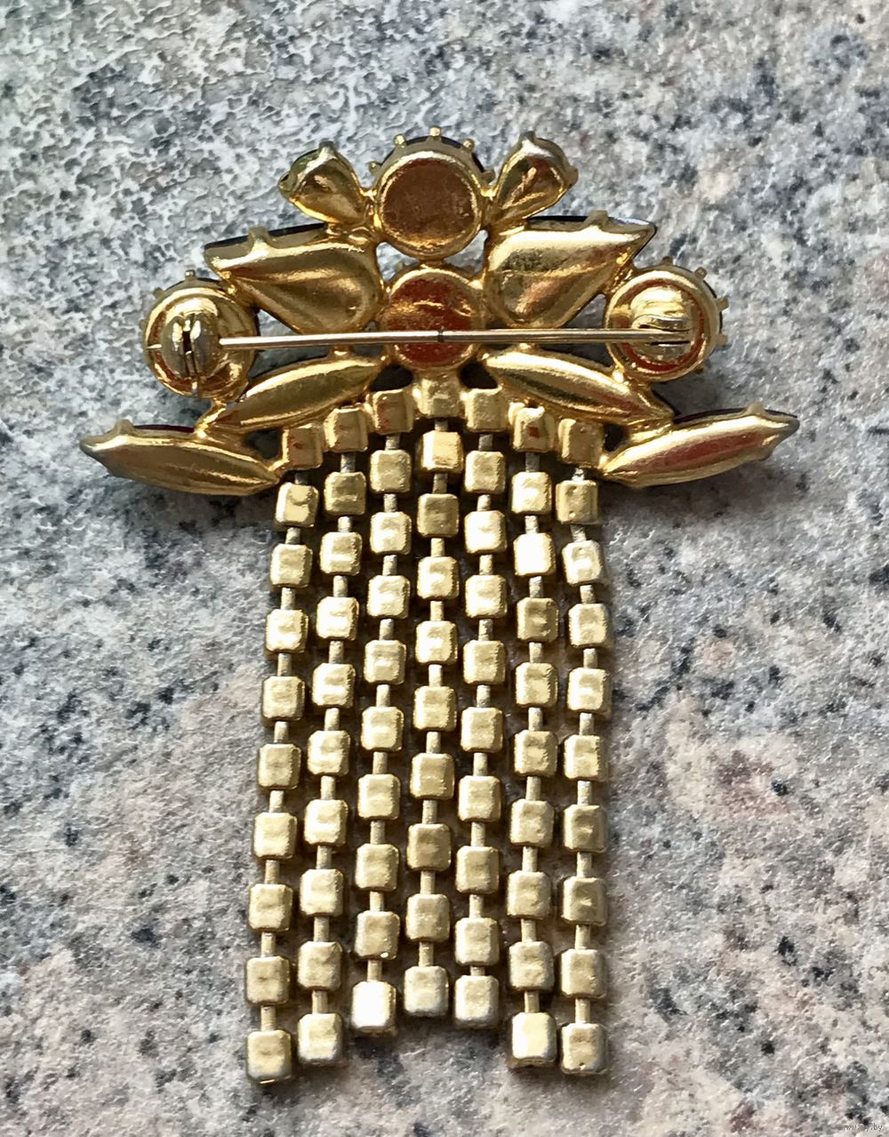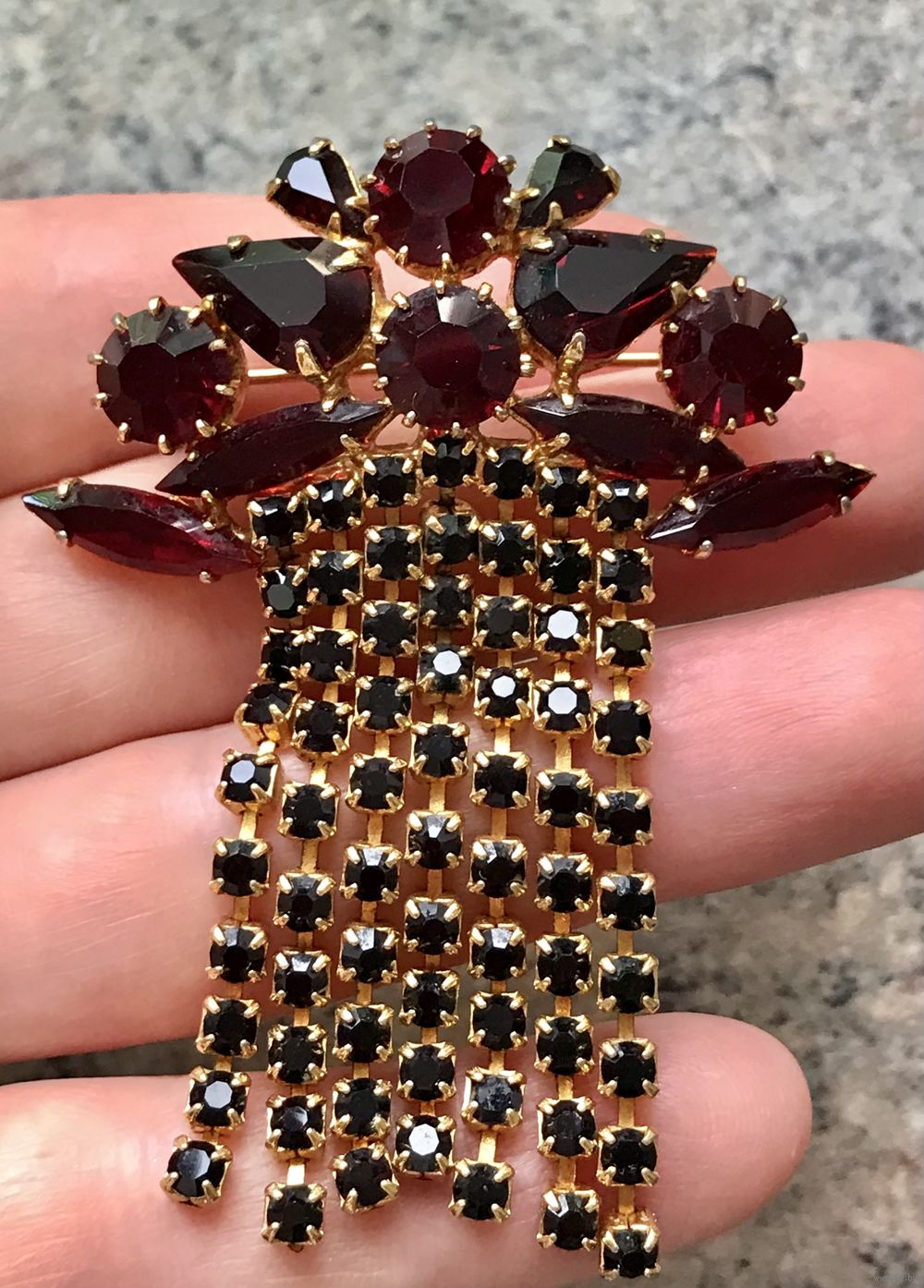 Винтажная чешская брошь с основой из латуни с позолотой и вставок из гранатового стекла. Размер броши 6,5х5см. Состояние хорошее.