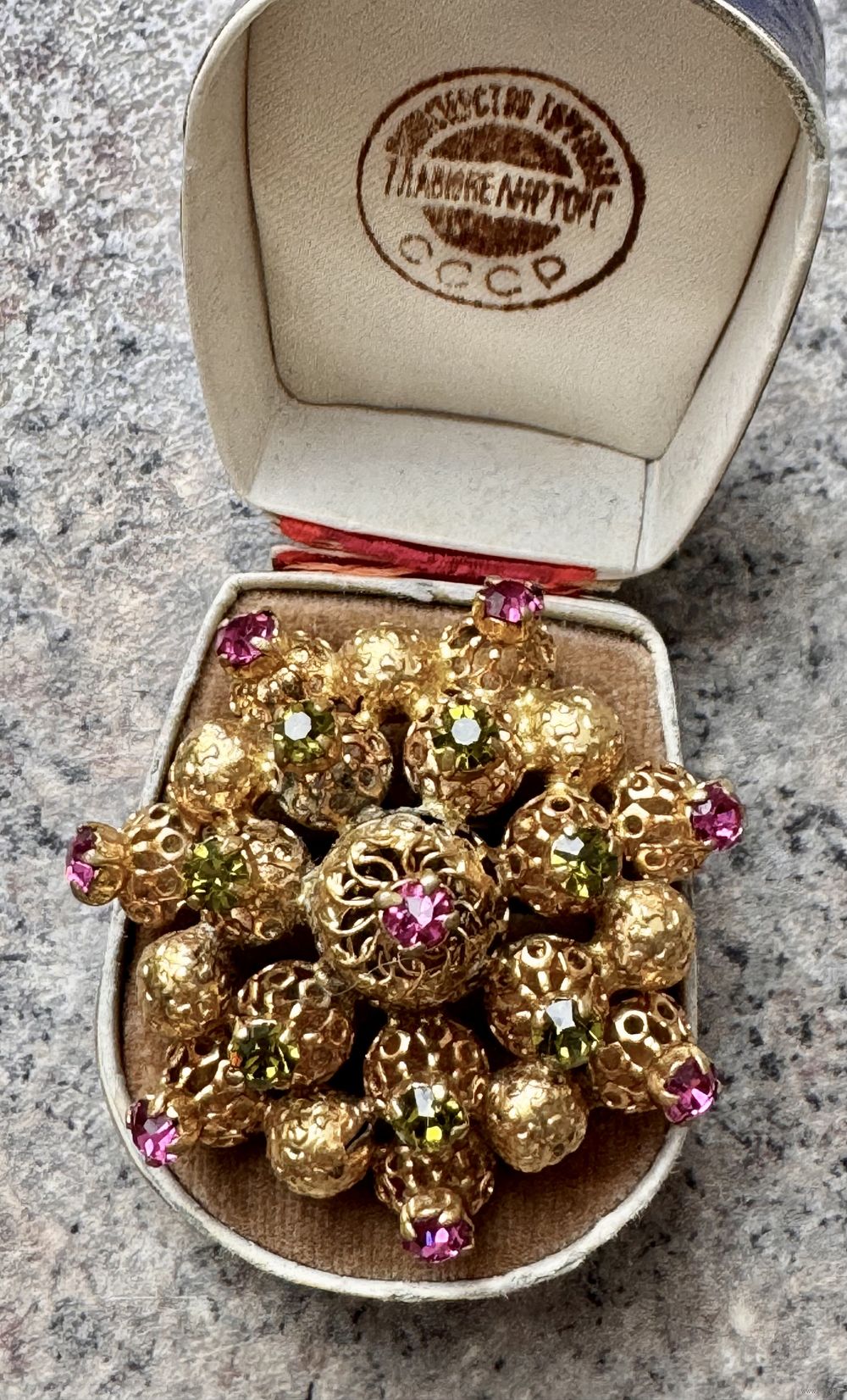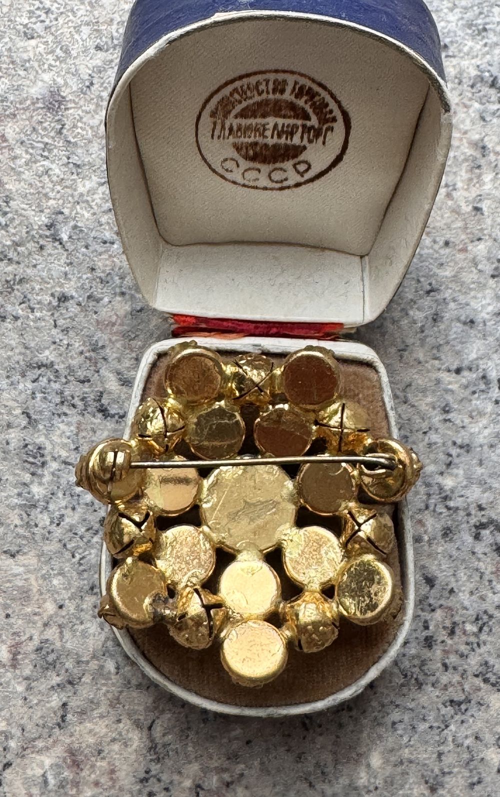 Винтажная брошь с основой из латуни, на лицевой стороне вставки из стекла розового и оливкового цветов. Диаметр броши 4,5см. Состояние хорошее.