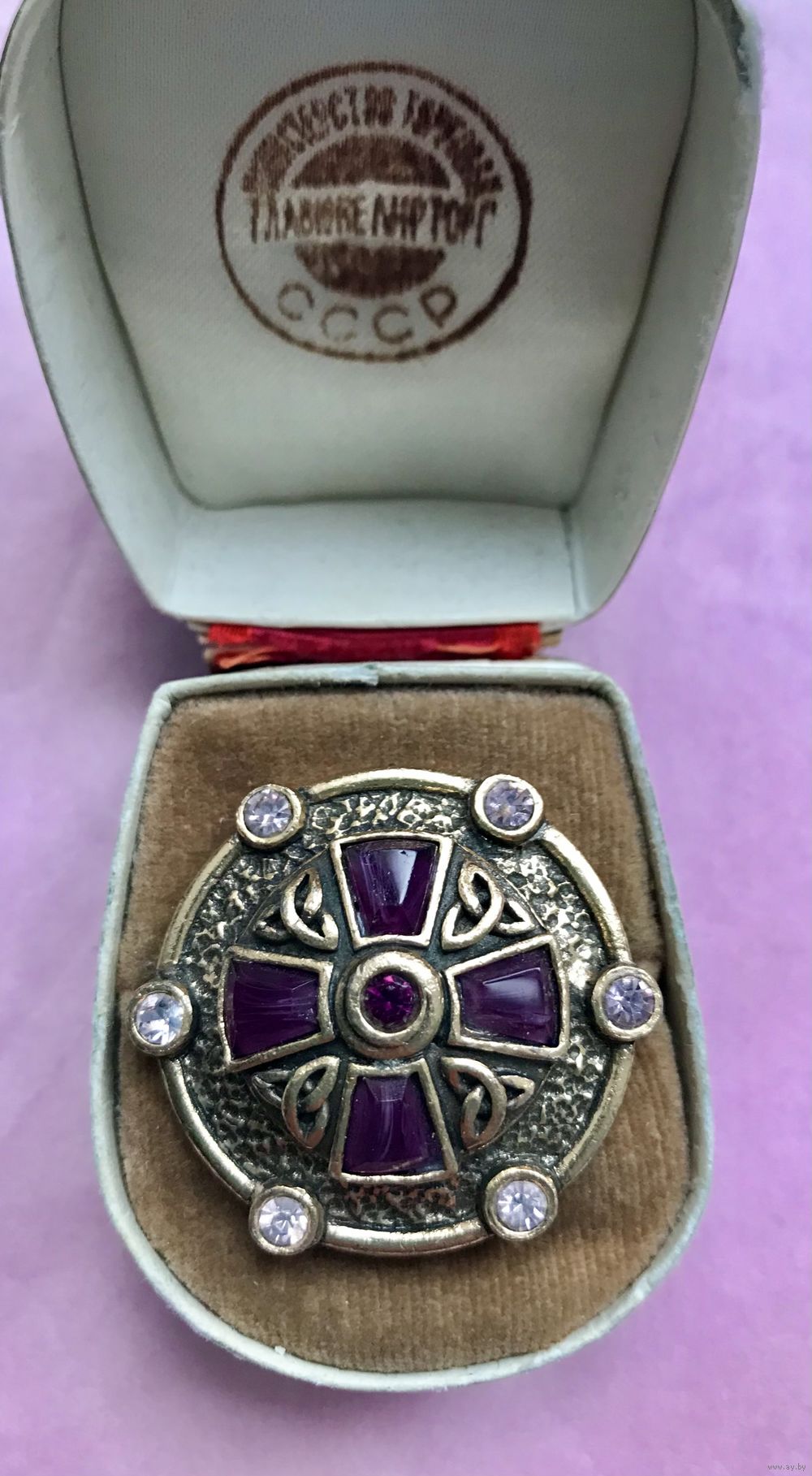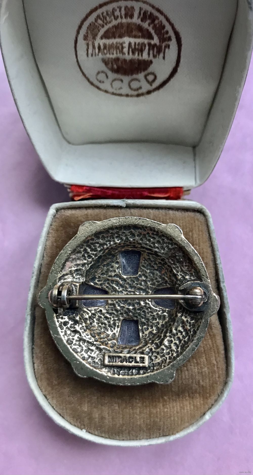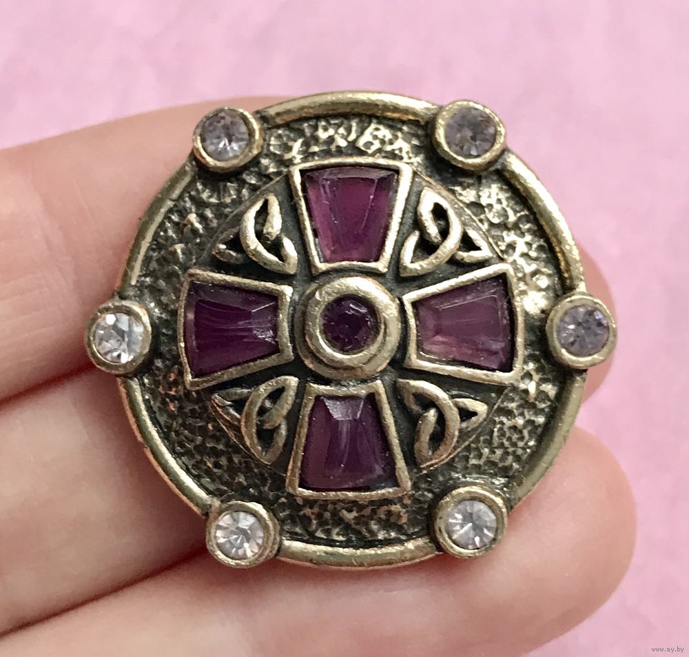 Винтажная брошь известного английского бренда Miracle, сделана в 1960-е гг. Основа из пьютера, лицевая сторона украшена кристаллами и смальтой. Дизайн выполнен в стиле кельтских старинных украшений. Диаметр броши 3,3см. Маркирована. Состояние хорошее.