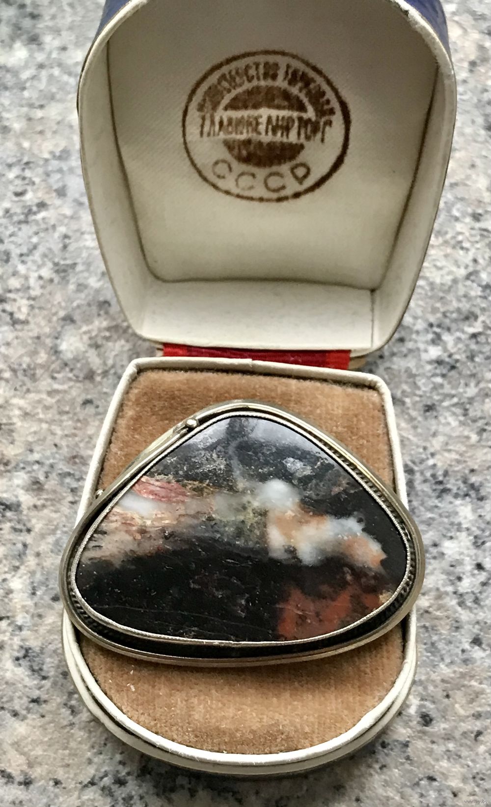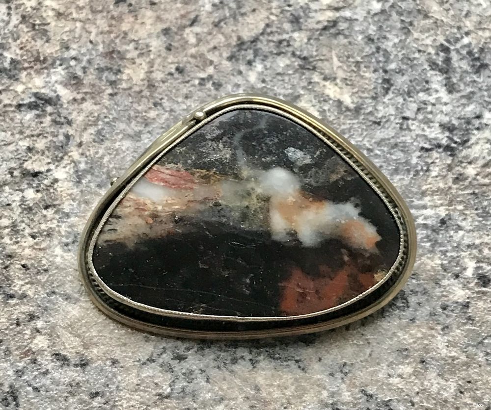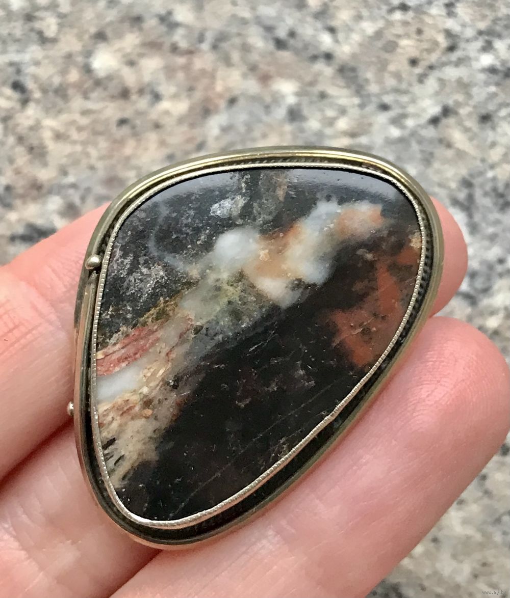 Брошь с основой из мельхиора и вставкой из нат.камня. Размер 4,2х3см., размер вставки 3,5х2,4см. Состояние хорошее.