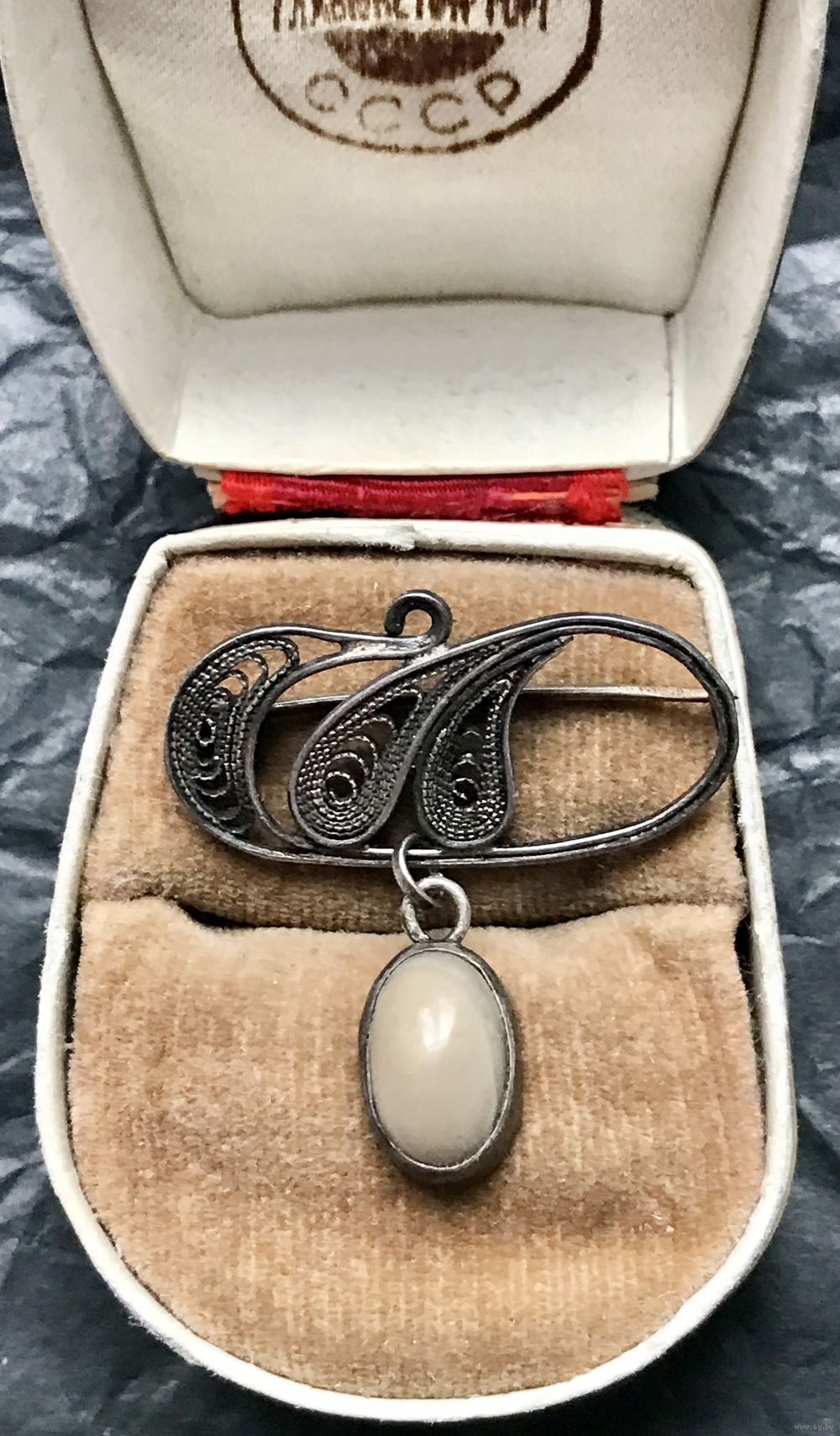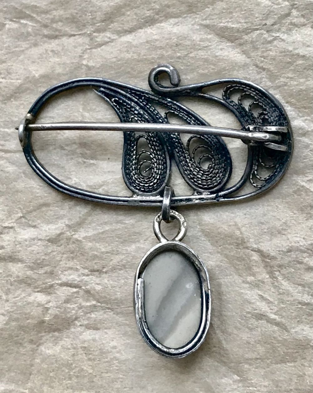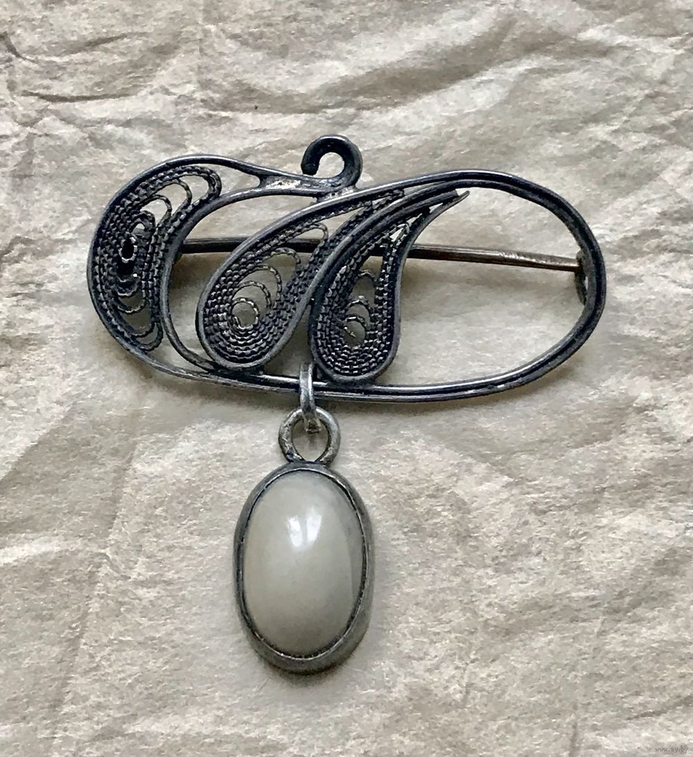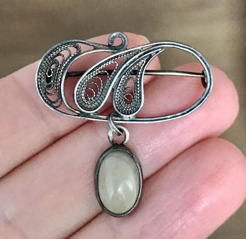 Небольшая брошь из серебра 800 пр. Сделана в Польше (в Кракове) в период с 1963 по 1986гг. о чем свидетельствует клеймо, которое стоит на крючке застёжки. Вставка на висюльке из камня. Высота броши с висюлькой 3,2см., ширина 3см. Состояние хорошее.