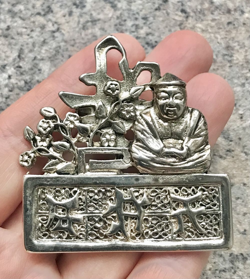Крупная брошь в виде китайского божества. Мне кажется, это мудрец Чен Лобань (хранитель денег). Размер броши 5,5х5,2см. Тяжёленькая. Состояние хорошее.