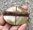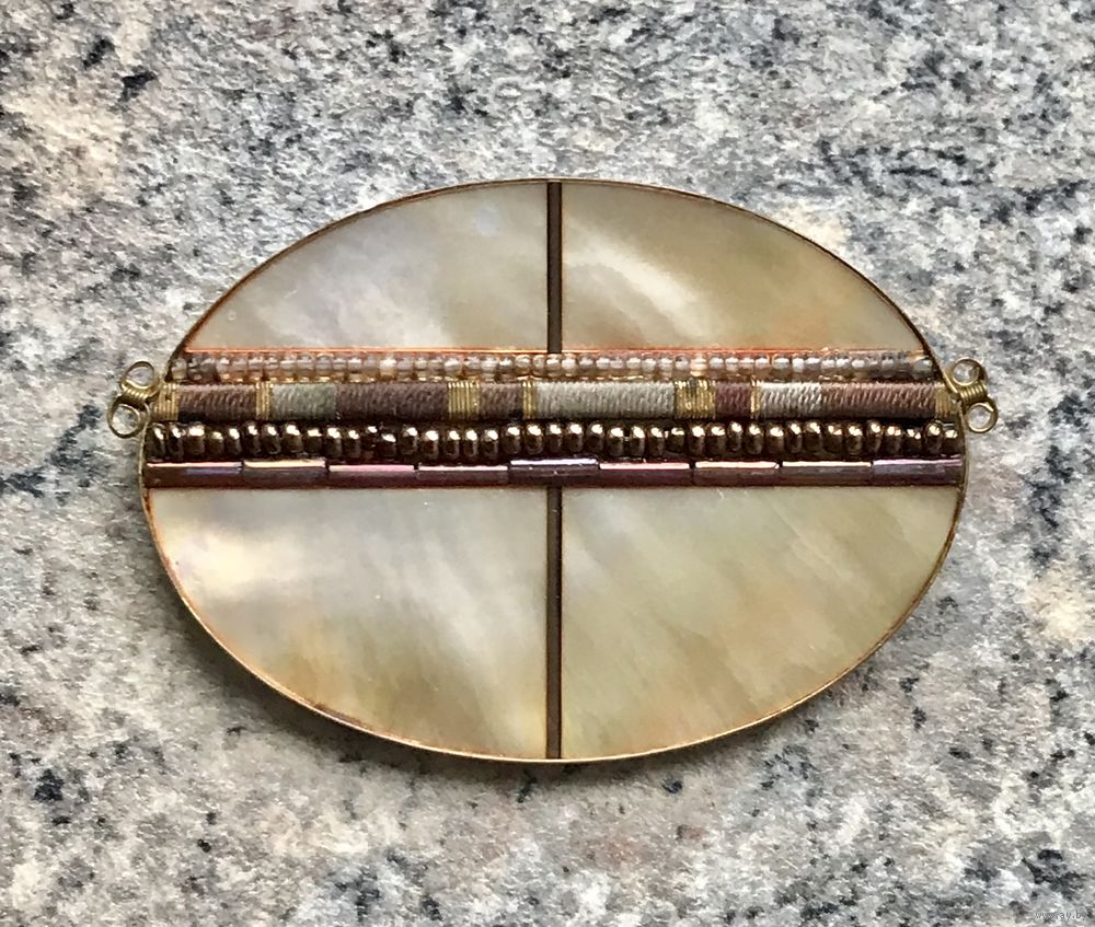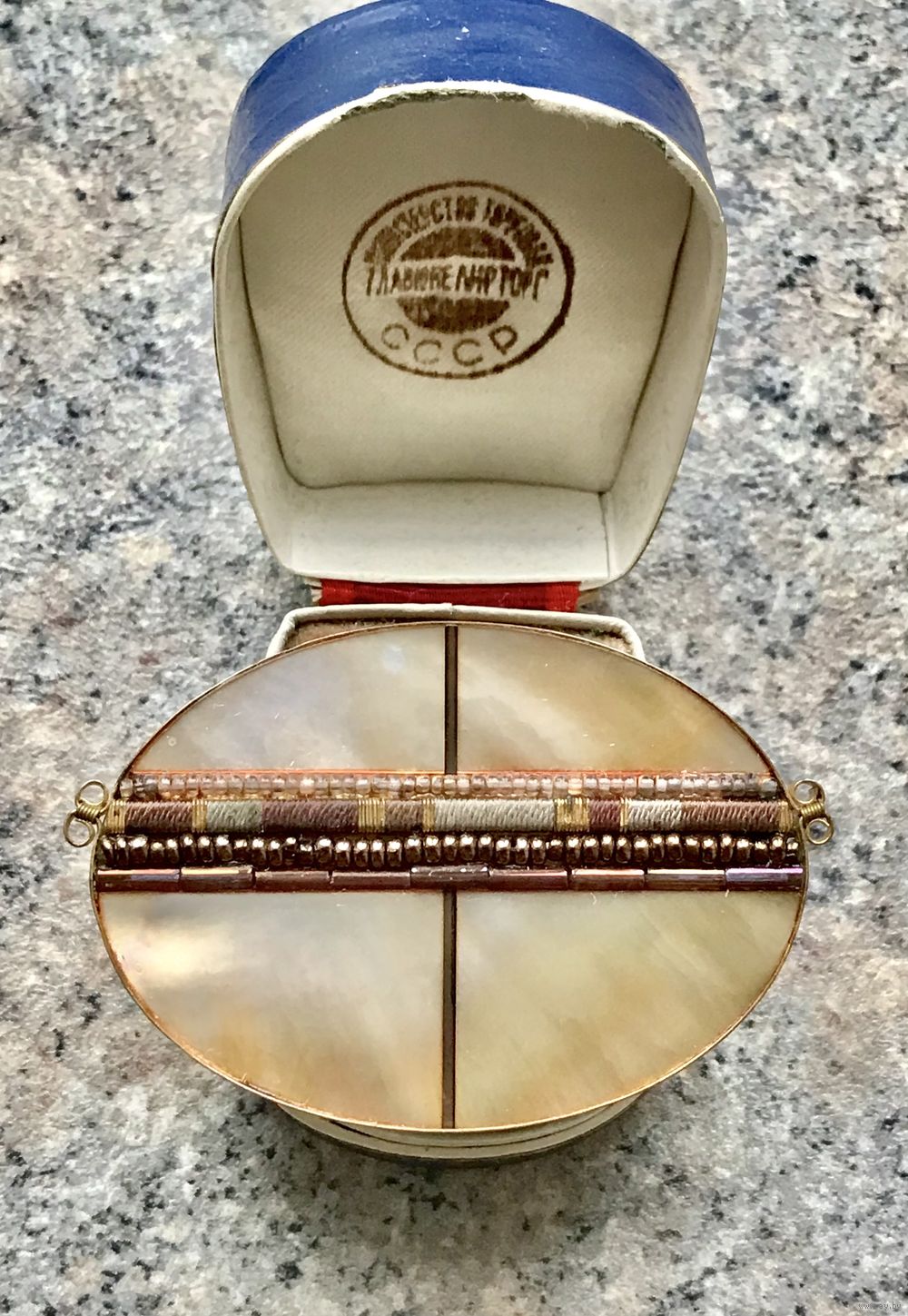 Крупная винтажная брошь с основой из металла золотистого тона, лицевая сторона украшена перламутровой пластиной, бисером и текстилем. Размер броши 6,5х4,3см. Состояние хорошее.