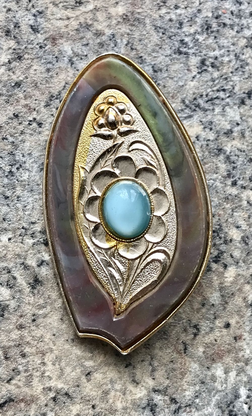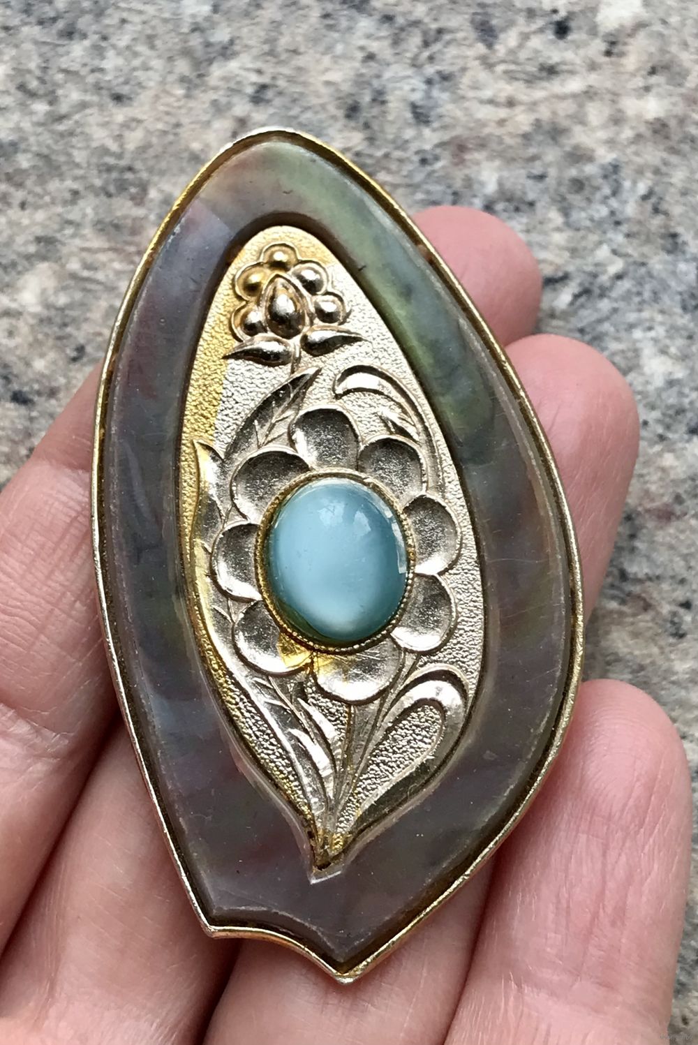 Винтажная бижутерная брошь родом из СССР. Центральная вставка из стекла (в нескольких местах есть следы клея). Брошь довольно крупная, размер 6,5х3,5см., но не тяжёлая.