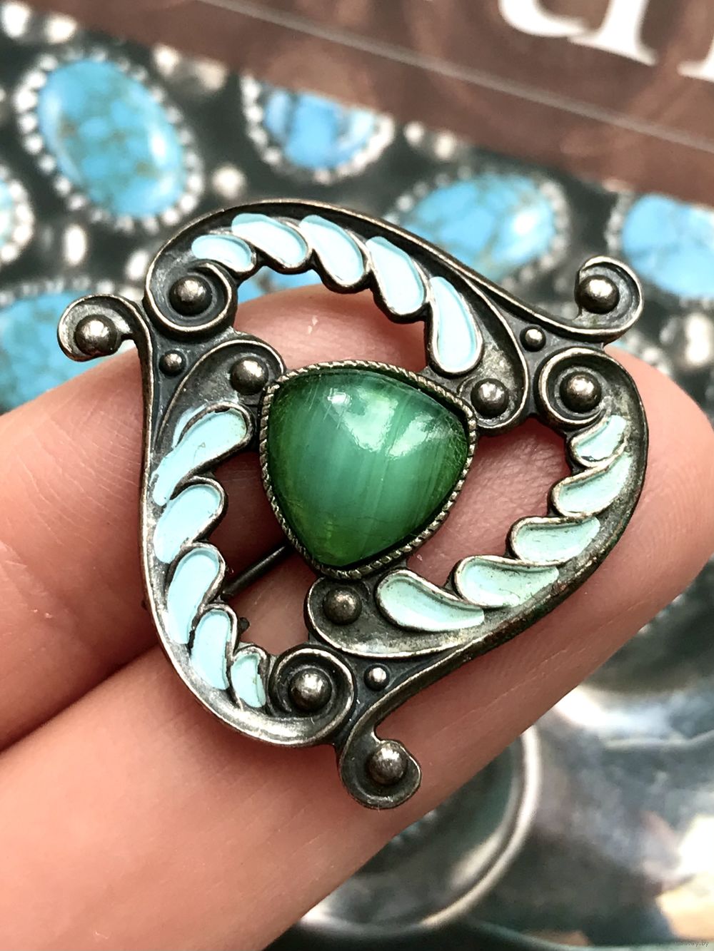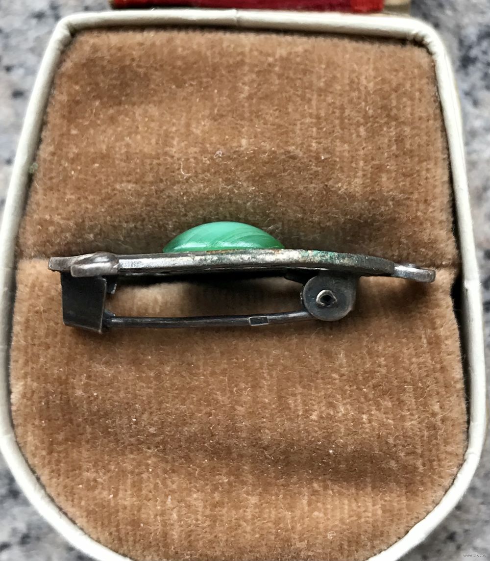 Брошь периода СССР из мельхиора (стоит клеймо МП1), чернение, эмаль, вставка из художественного стекла. Размер броши 3х3см. Состояние хорошее.