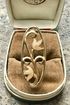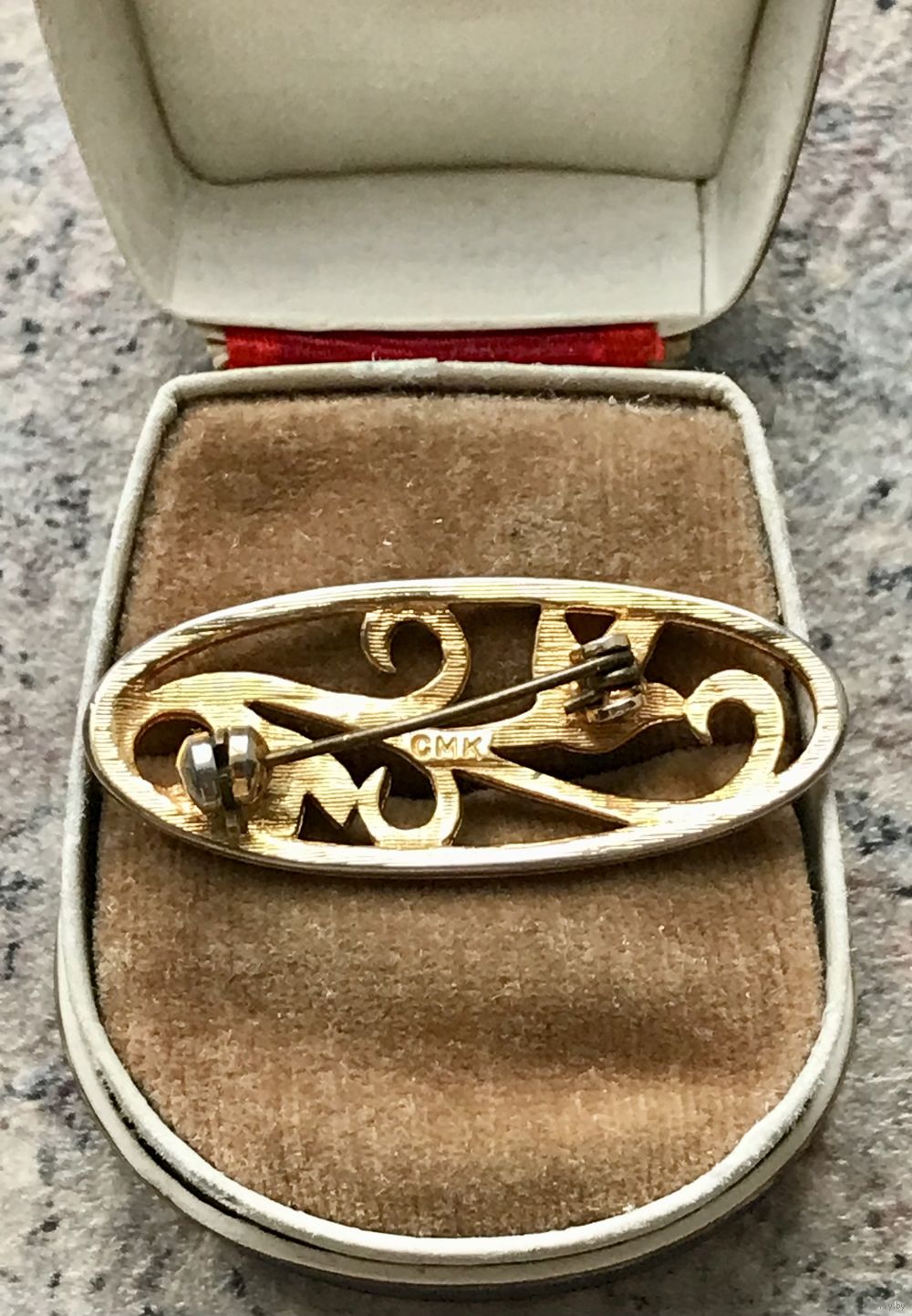 Небольшая винтажная брошь с основой из металла золотого тона, лицевая сторона украшена эмалью. На металле есть незначительные потёртости. Размер броши 4х1,6см. Стоит маркировка CMK (атрибутировать не удалось).