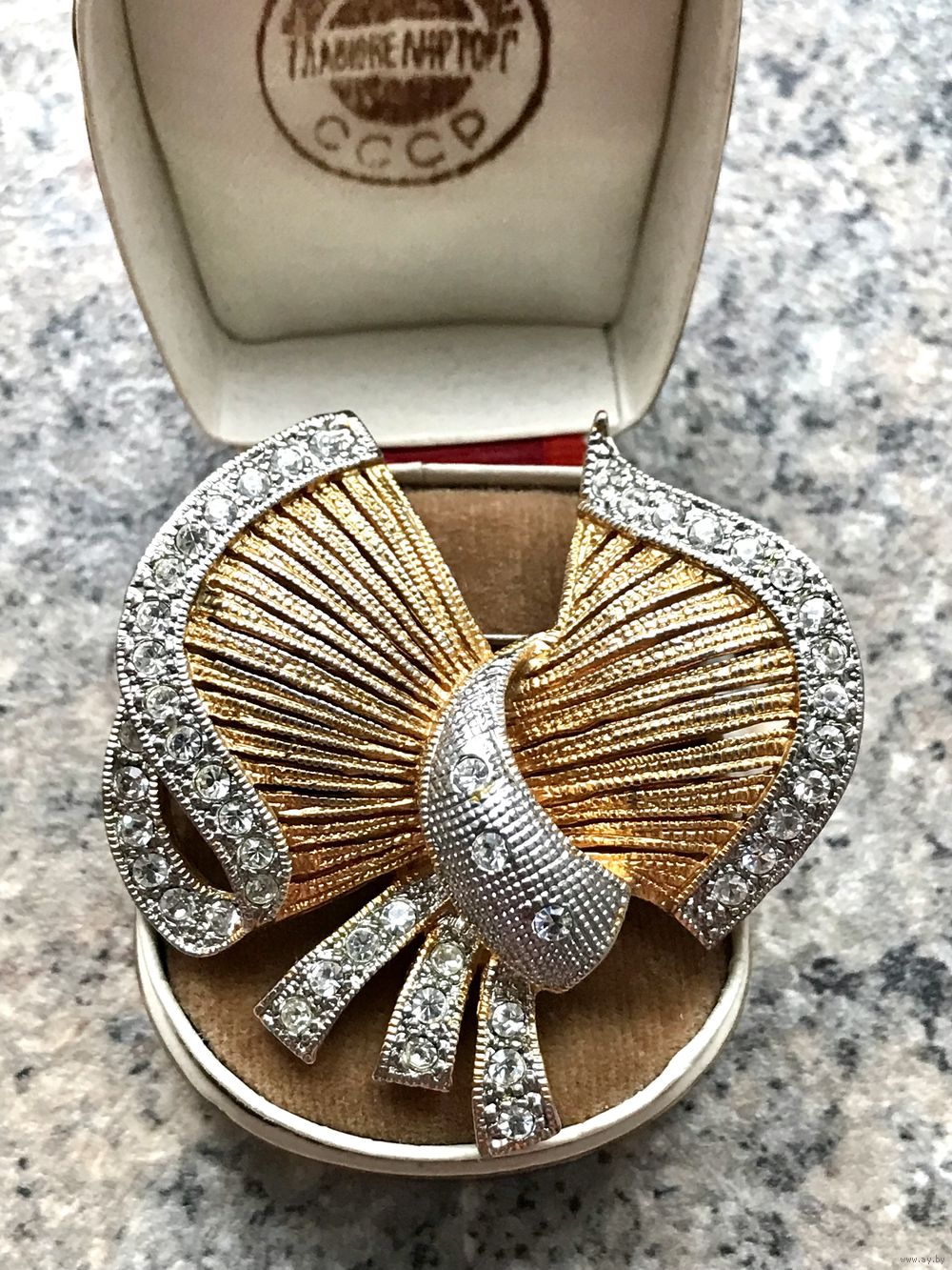 Крупная эффектная брошь с основой из металла золотистого тона, вставки кристаллы. Размер броши 5х5см. Местами имеются незначительные потёртости позолоты. Тяжёленькая. Общее состояние хорошее.