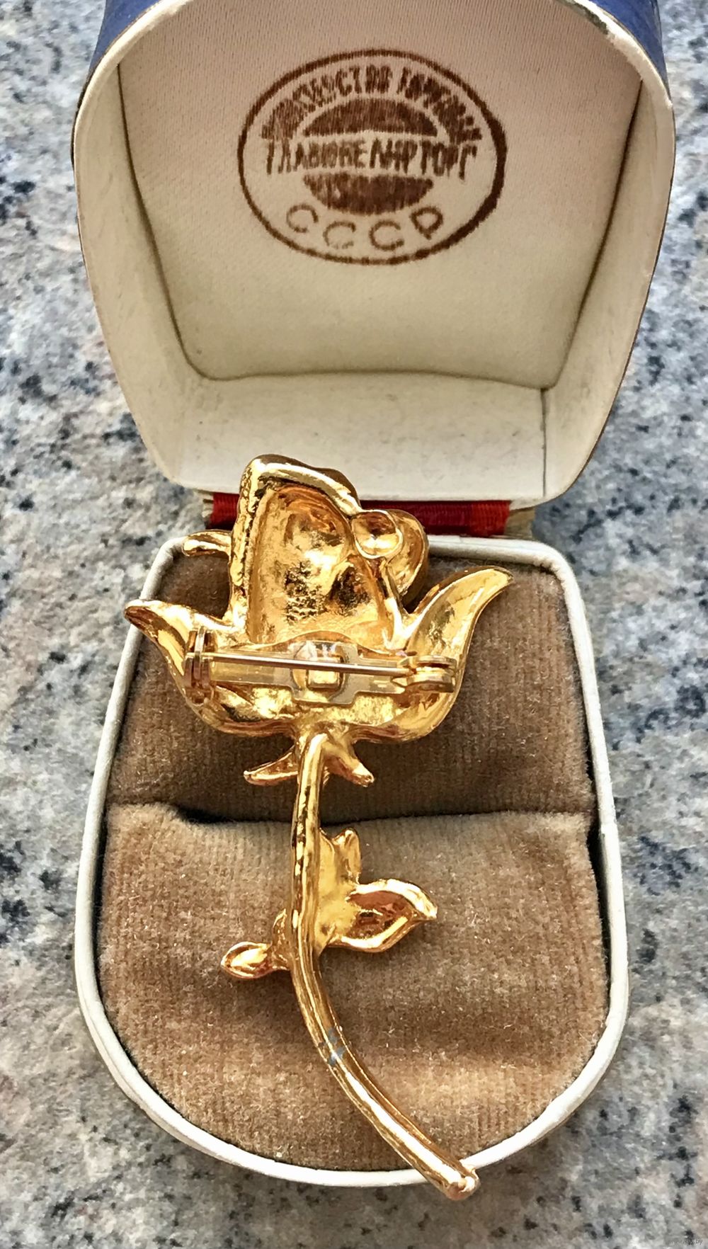 Винтажная брошь с основой из металла золотого тона. Германия. Высота 5,5см., размер бутона 2,5х3см. В нескольких местах есть незначительные потёртости позолоты. Общее состояние украшения хорошее.