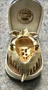 Чешская брошь из 70-х гг. Основа выполнена из металла золотого тона, лицевая сторона украшена прозрачными кристаллами. На броши сверху не хватает хвостика (этот момент учтён в цене). Размер 6,5х3,5см.