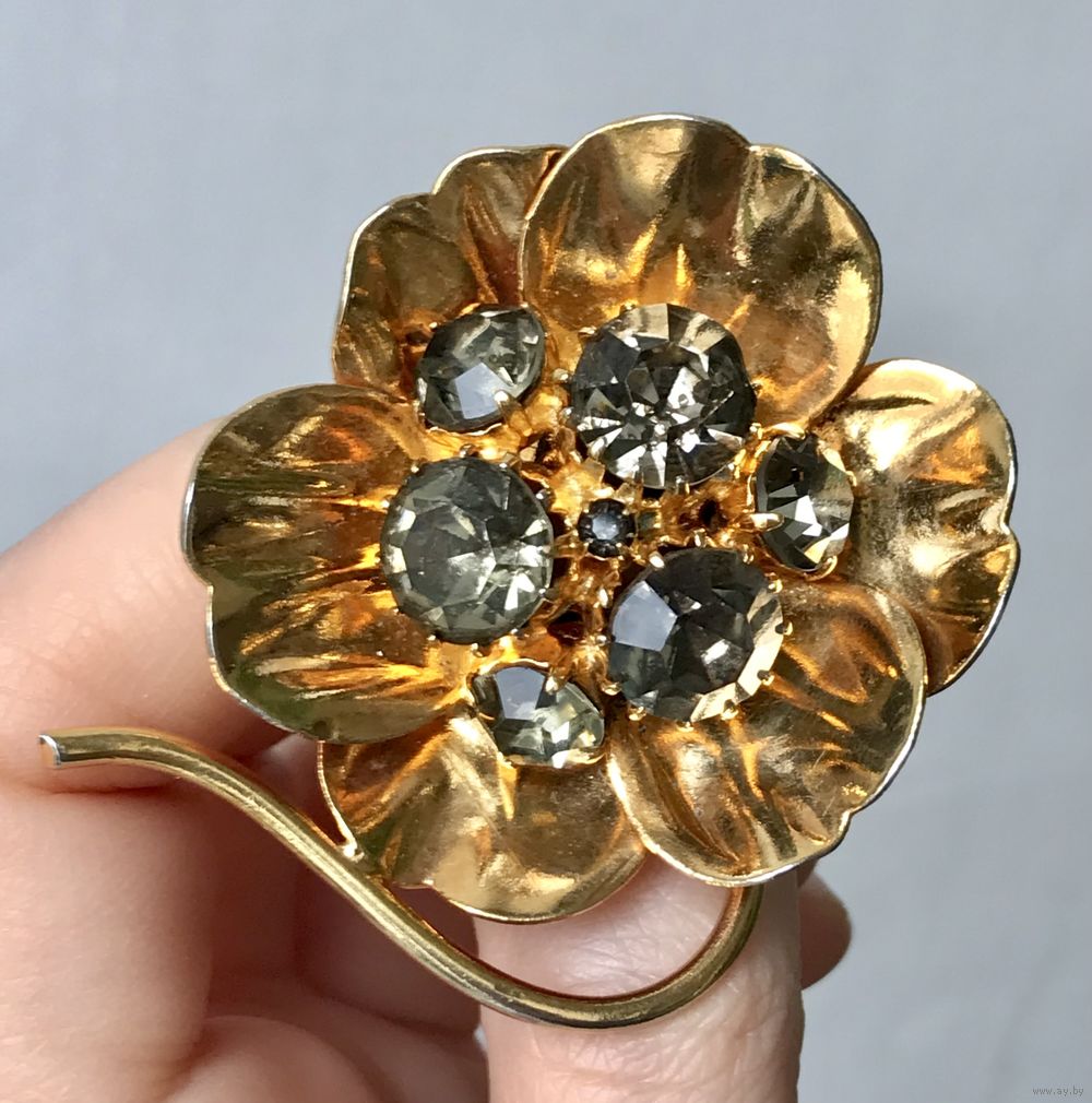 Винтажная (1970-е г.) крупная брошь со вставками из чешского стекла дымчатого цвета, размер 5х4 см., имеются незначительные потертости на металле. Общее состояние броши хорошее.