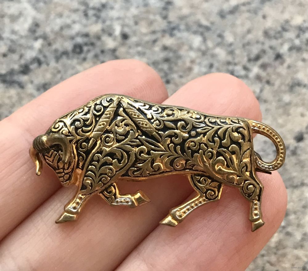 Винтажная (1970-е гг.) брошь в технике дамаскин. На лицевой стороне имеются небольшие потёртости на металле. Размер 4,2х2см.