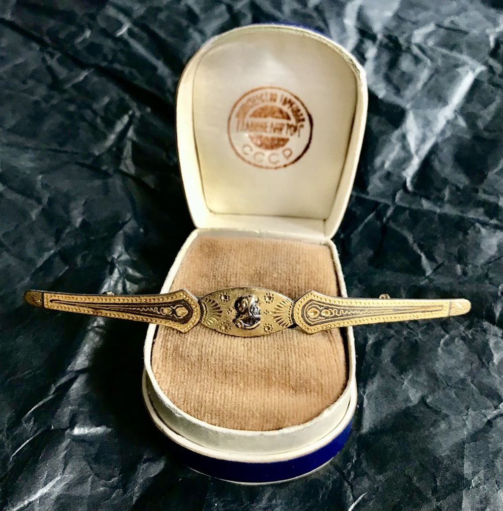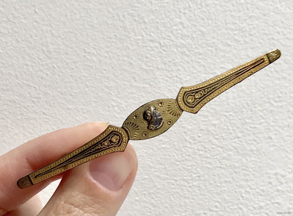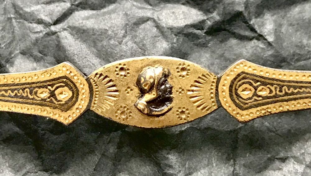 Брошь-планка выполнена в технике дамаскин, Испания, первая половина ХХ века. Размер 9х1,4см., местами есть незначительные потемнения и потёртости на металле.