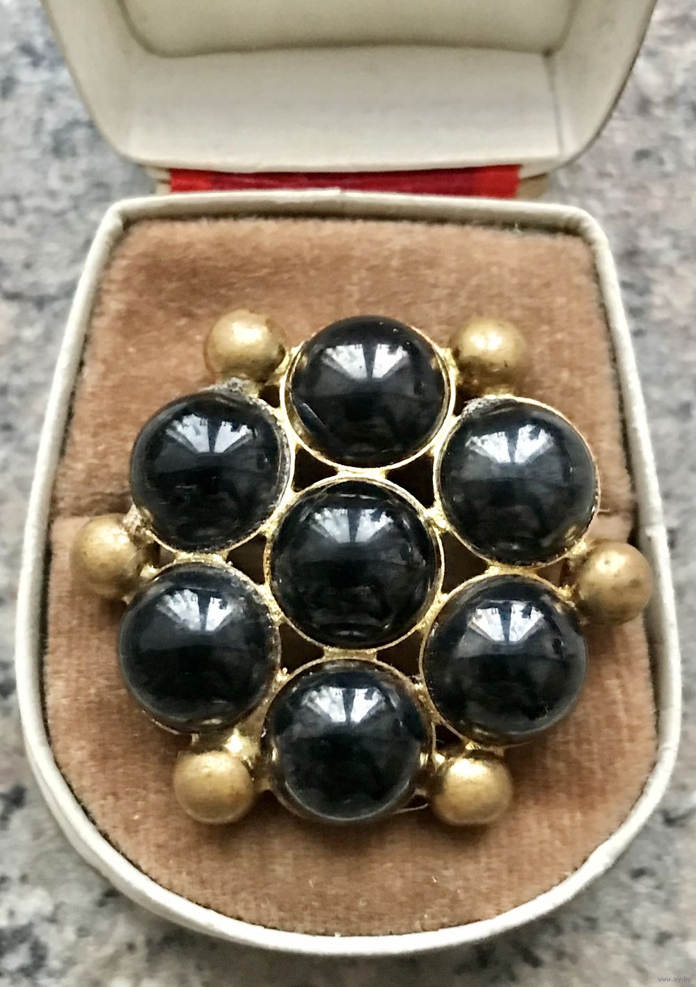 Винтажная брошь с основой из латуни, лицевая сторона украшена кабошонами из стекла чёрного цвета. Диаметр 3,5см. Состояние хорошее.
