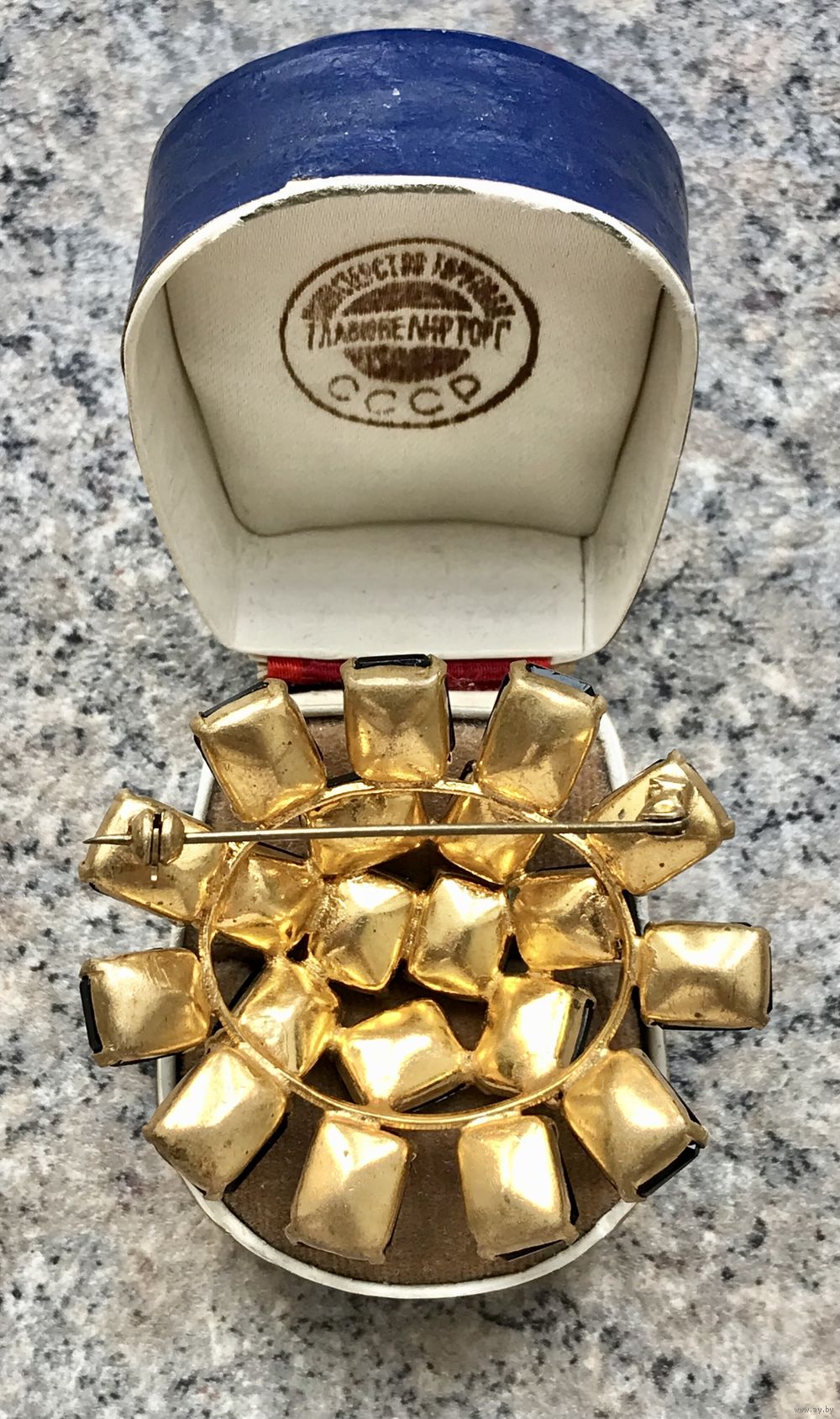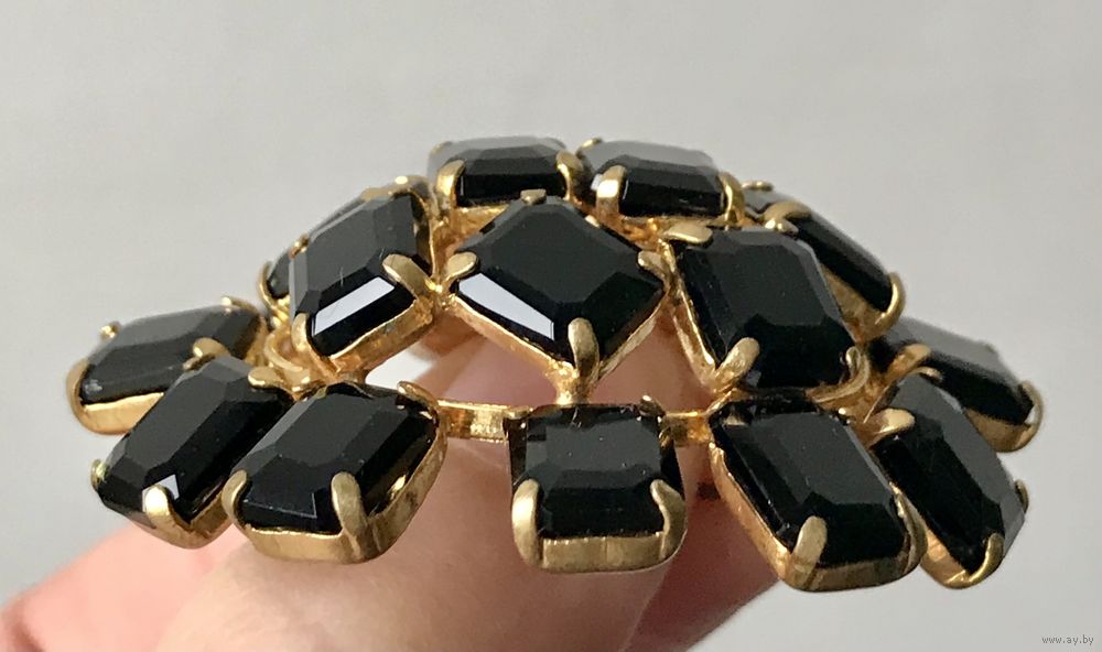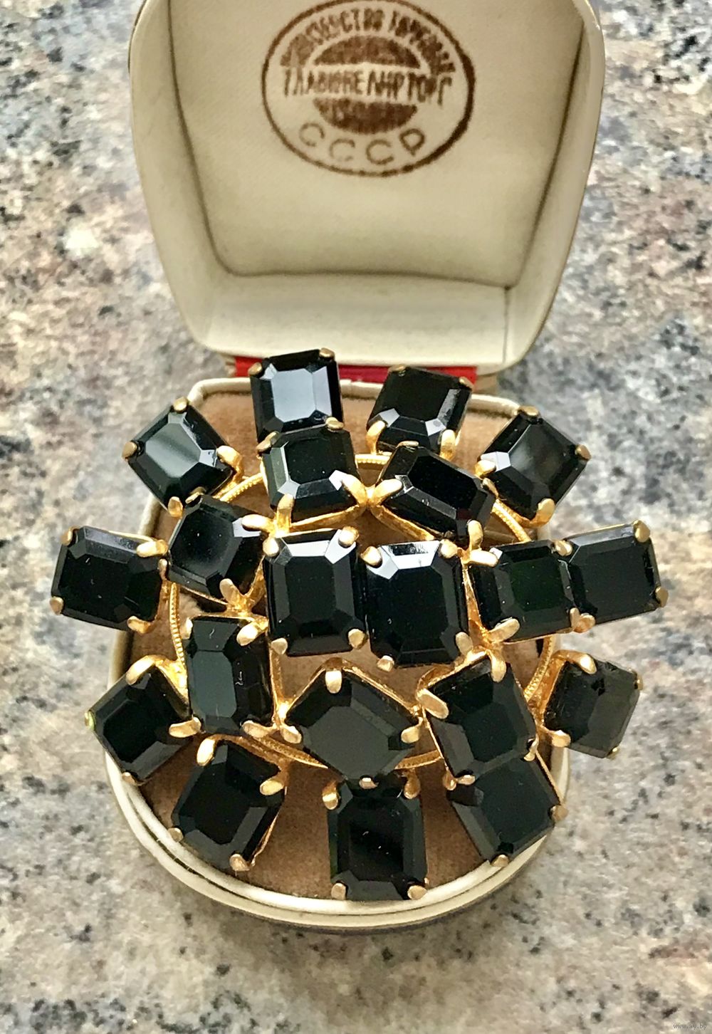 Крупная чешская купольная брошь с основой из латуни и вставками из чёрного стекла. Размер броши 5,2х4,6см., размер вставок 1х0,8см. Состояние хорошее.