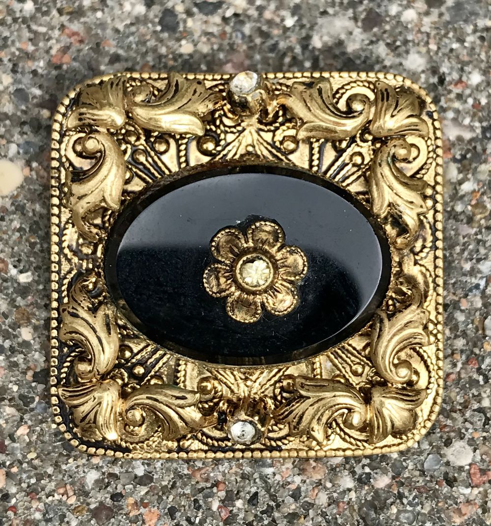 Небольшая винтажная чешская брошь из латуни со вставкой из чёрного стекла и кристаллов. Размер 3,5х3,5см. Состояние хорошее.