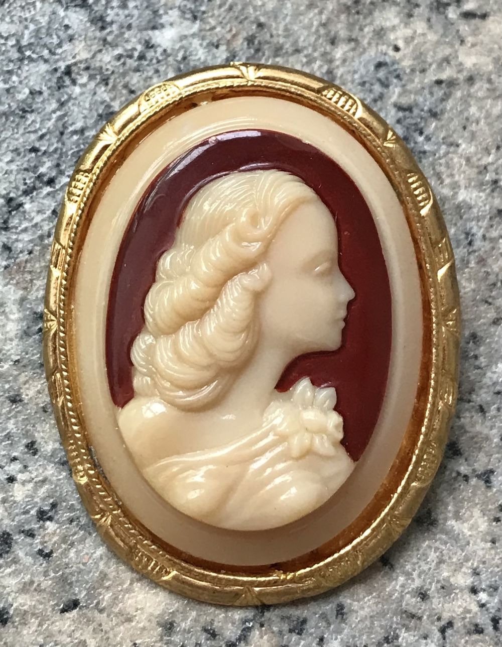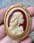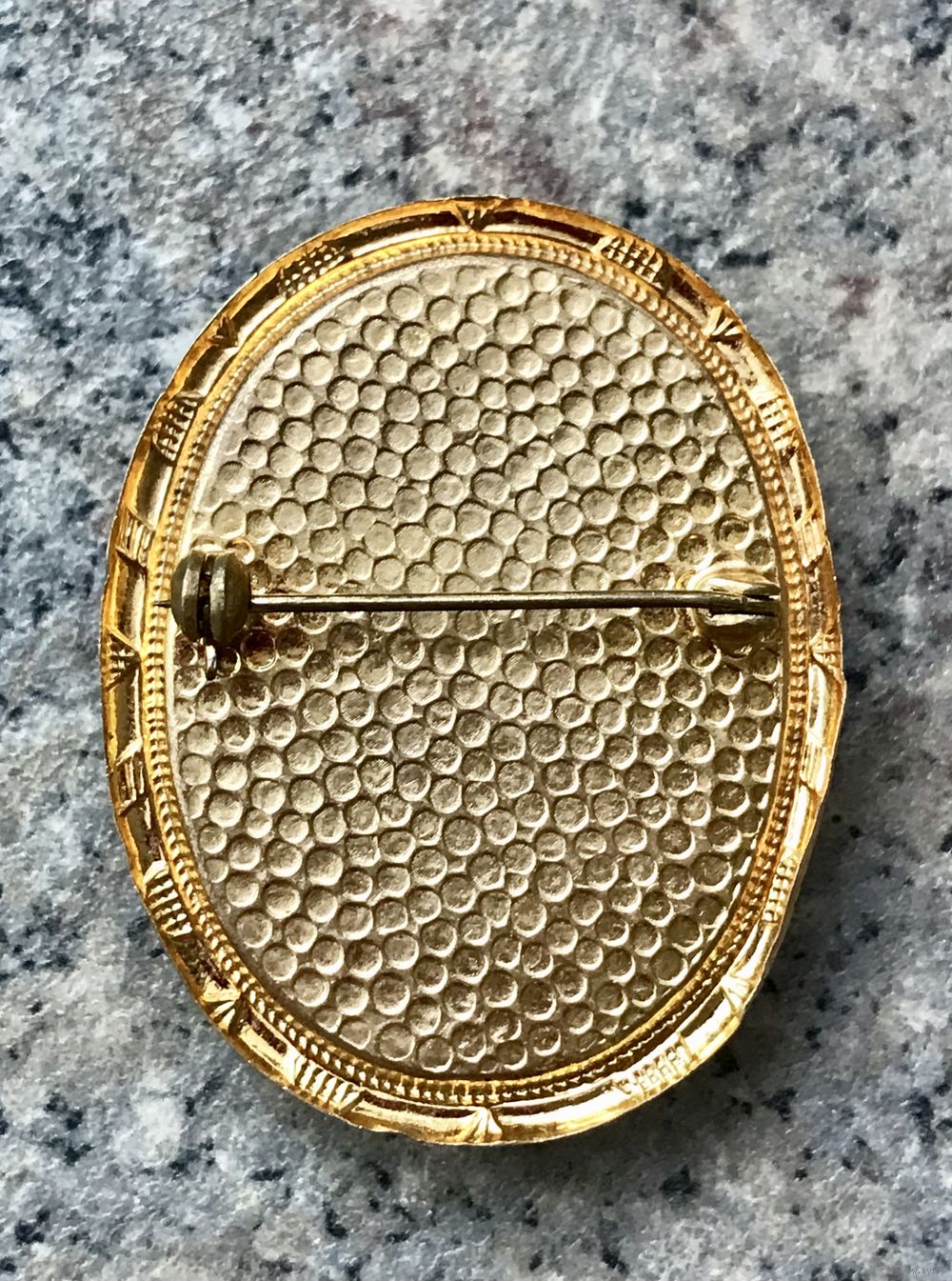 Крупная винтажная брошь камея. Основа из латуни с позолотой, камея из целлулоида. Размер 4,5х3,5см. Состояние хорошее.