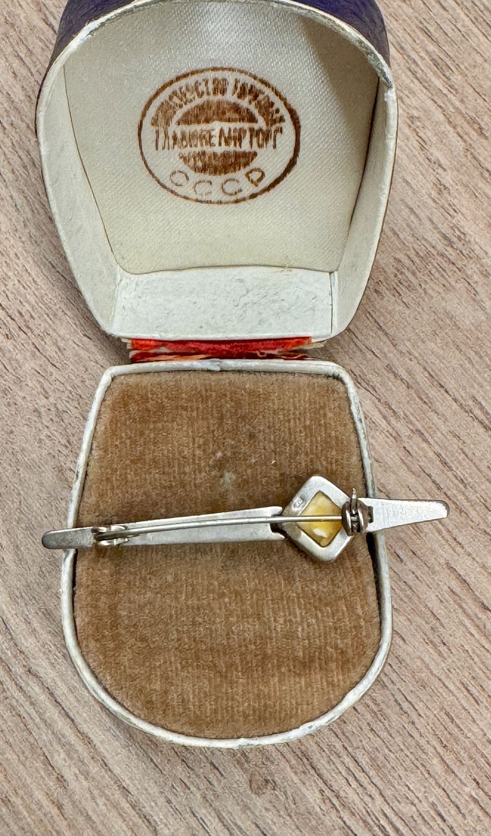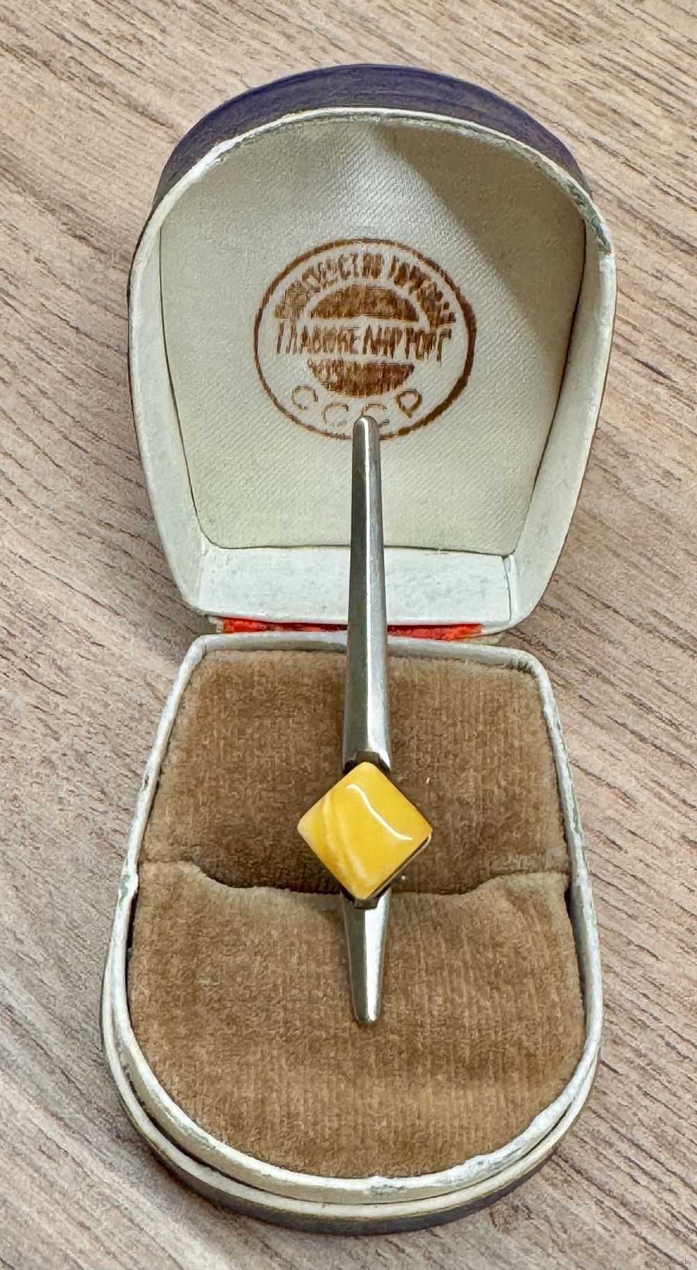 Винтажная брошь-планка из мельхиора и вставки из янтаря. Сделана в 1987г. в Калининграде (на обратной стороне стоит отметка .7Я). Длина броши 5см., размер вставки 0,7х0,7см. Состояние хорошее.