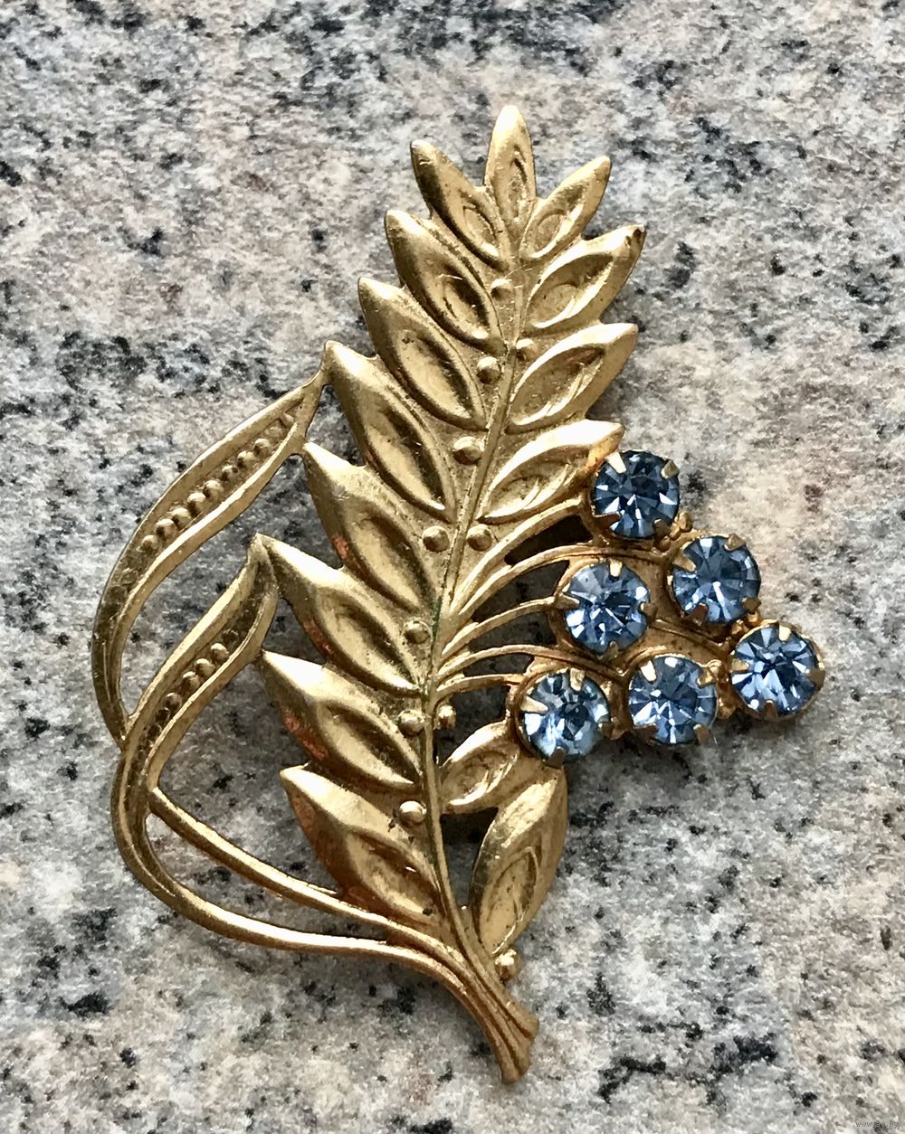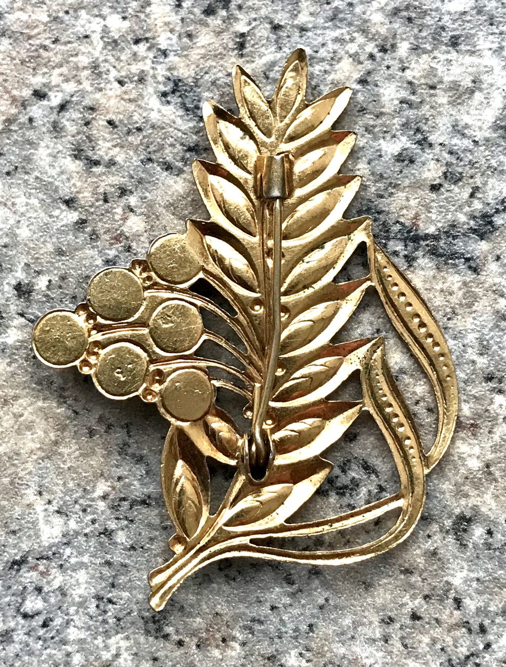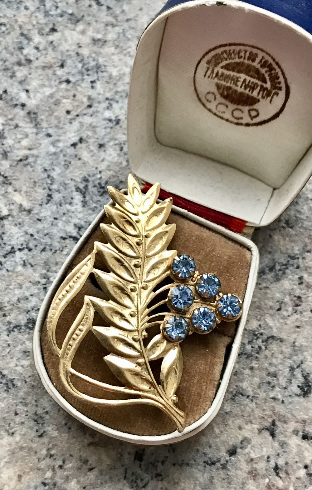 Брошь периода СССР с основой из латуни с позолотой (клеймо) и вставками из цветного стекла. Размер броши 5х4см., диаметр кристаллов 0,4см. Состояние хорошее.