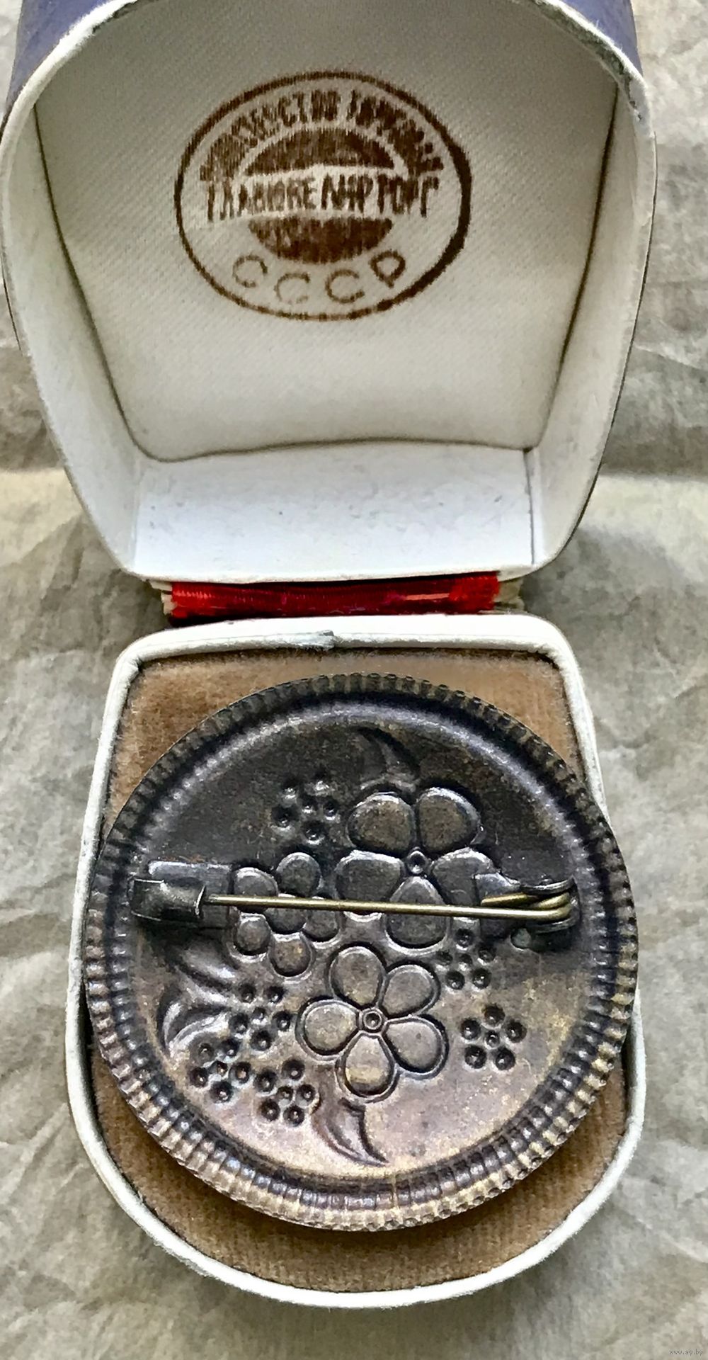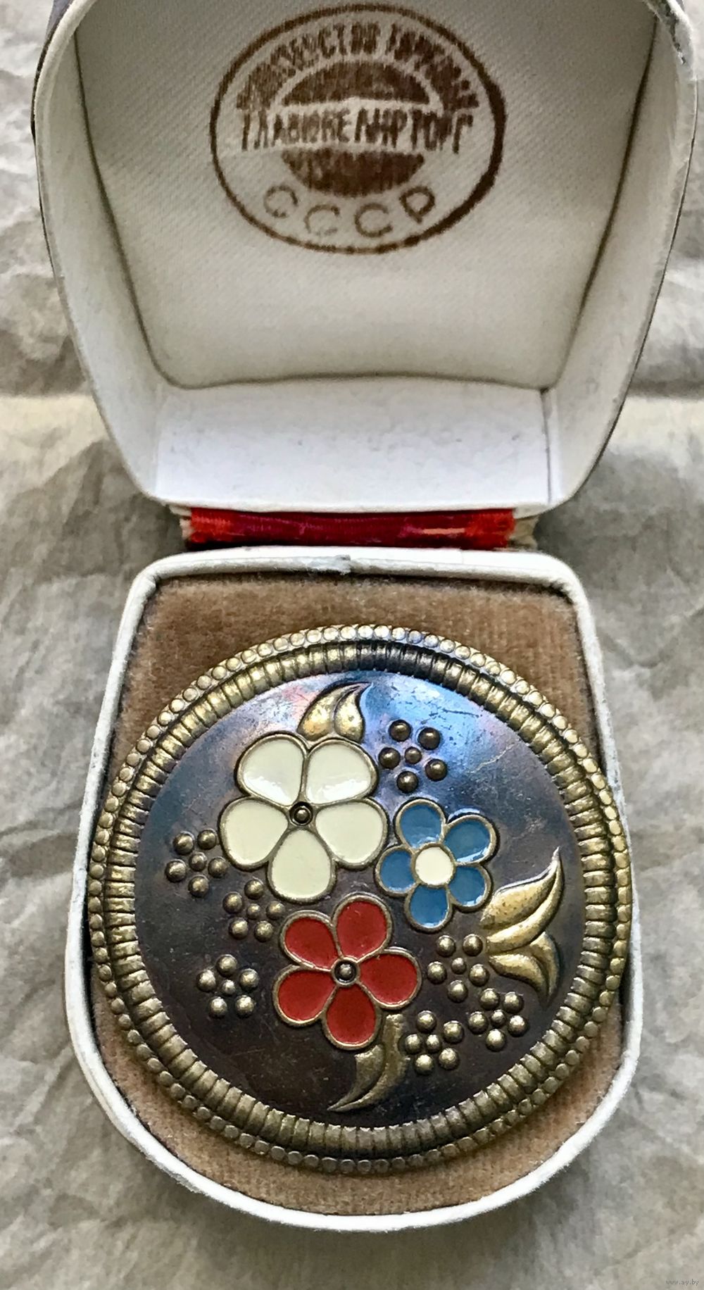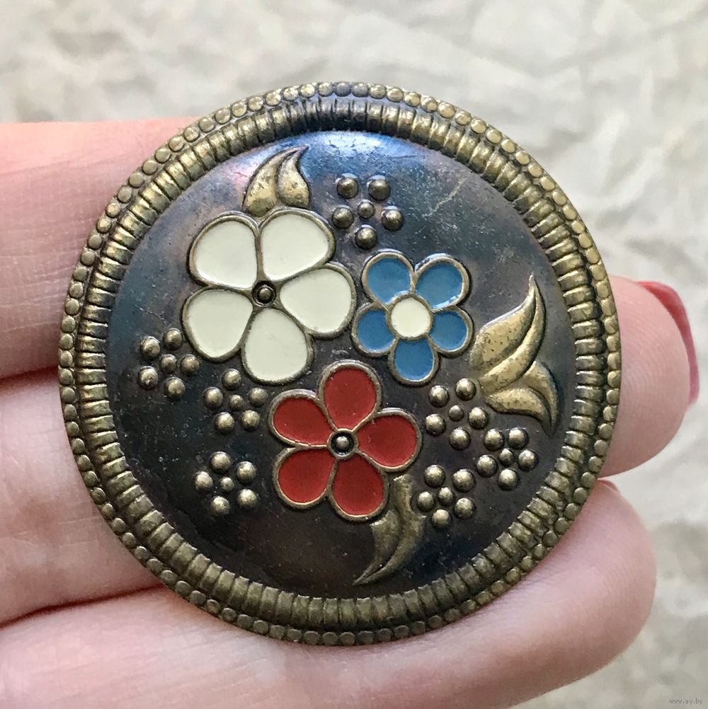 Винтажная брошь с основой из металла, лицевая сторона украшена цветочным узором и эмалями. Диаметр броши 3,8см. Состояние хорошее.