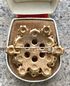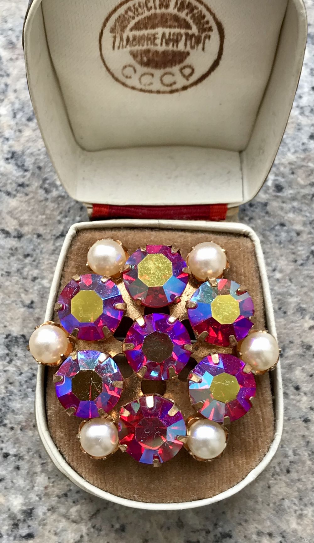 Винтажная брошь (период СССР) со вставками из красного стекла с покрытием AB и бусинами под жемчуг. Изготовлена на Душанбинском ювелирном заводе. На игле стоит клеймо. Диаметр 4см. Состояние хорошее.