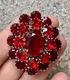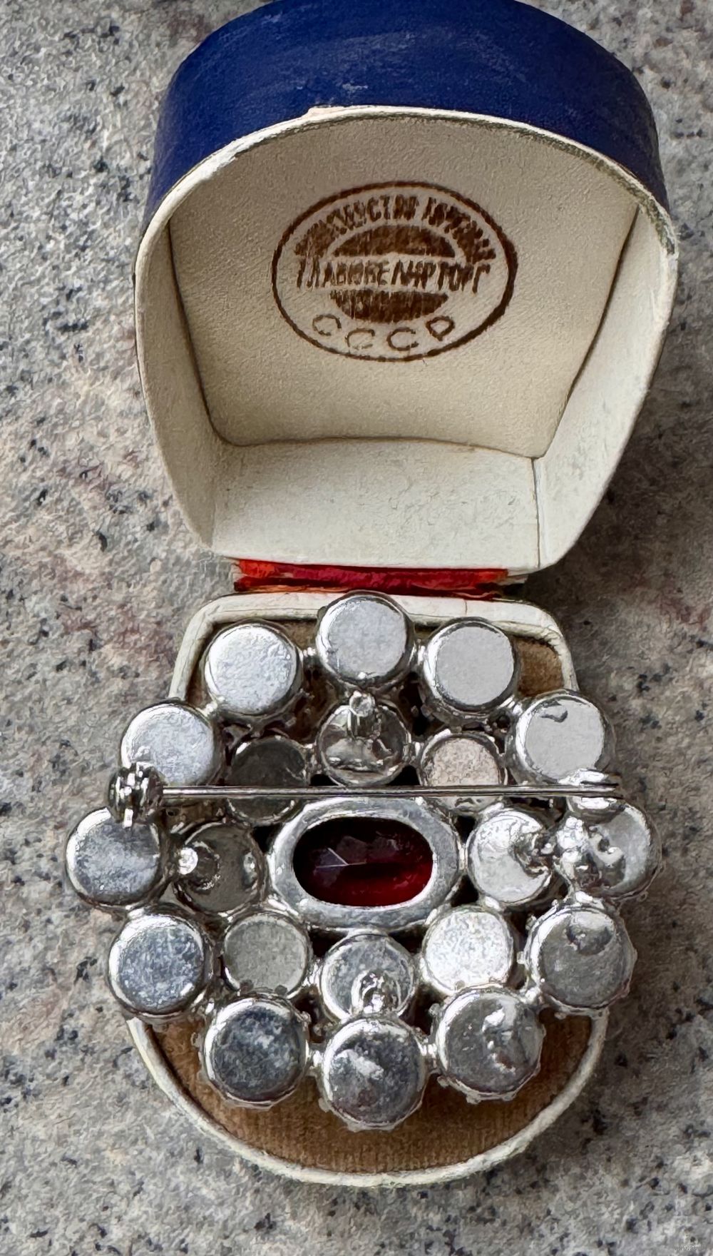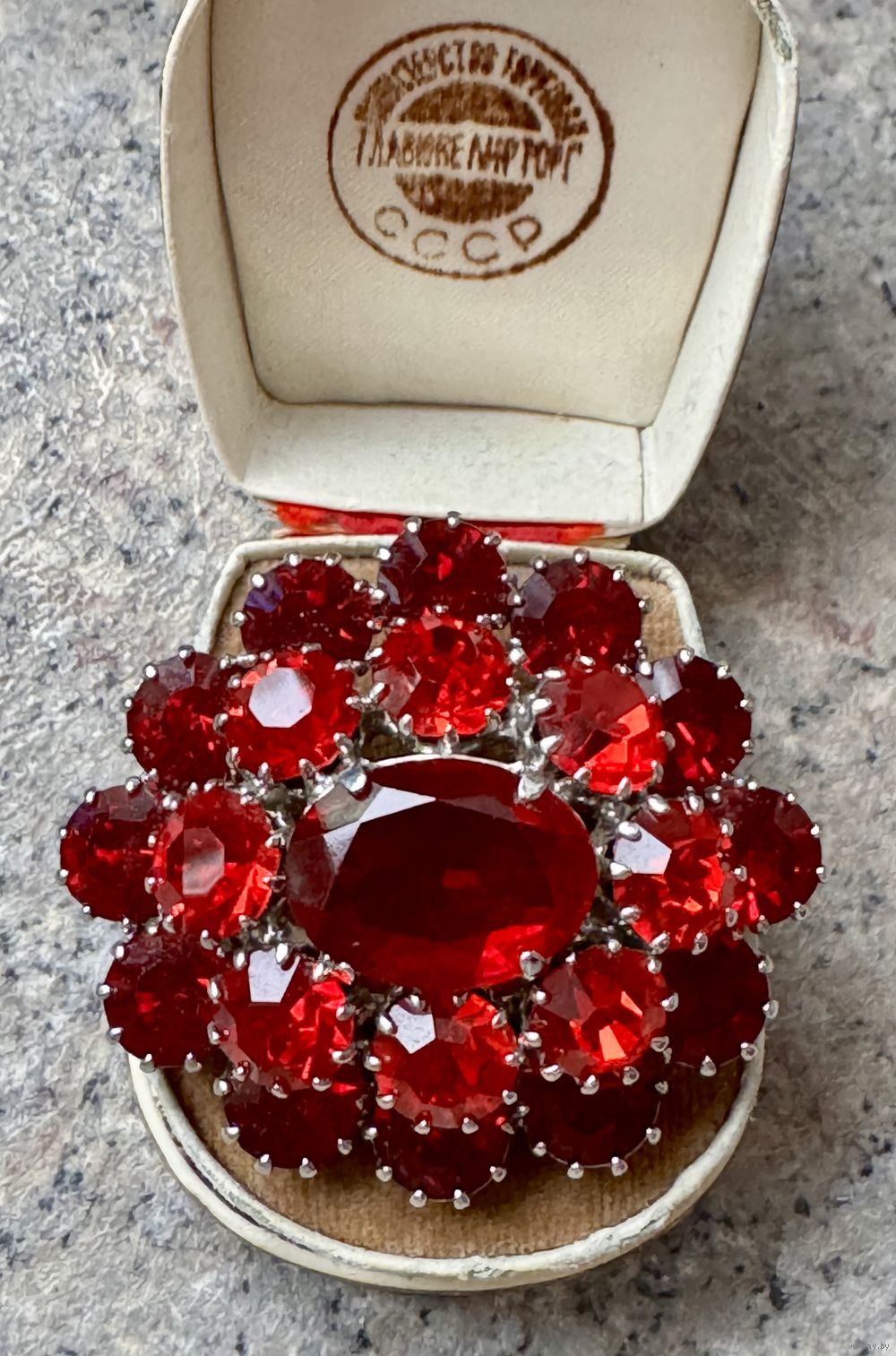 Крупная винтажная чешская трехуровневая брошь с основой из латуни с серебрением, вставки из стекла рубинового цвета. Размер 4,5х4см., высота 1,5см. Состояние хорошее.