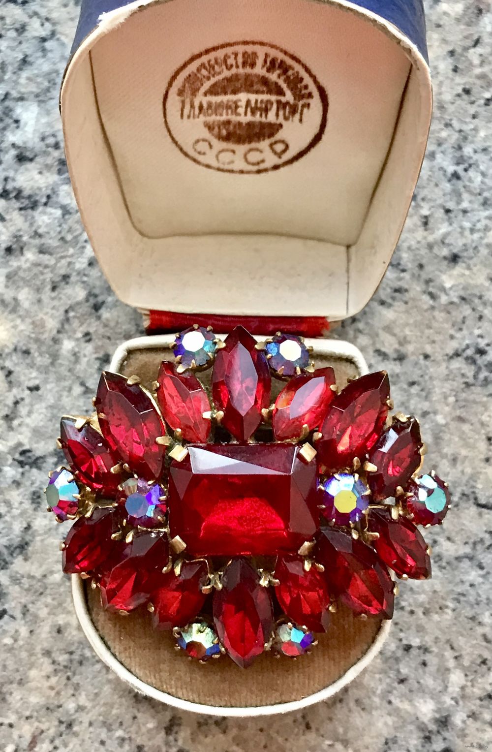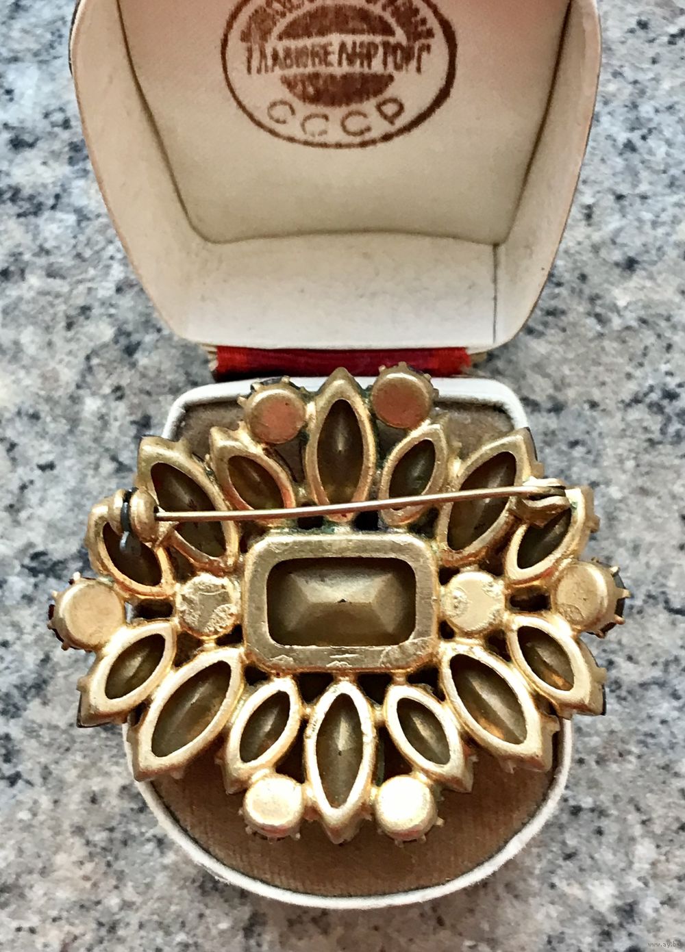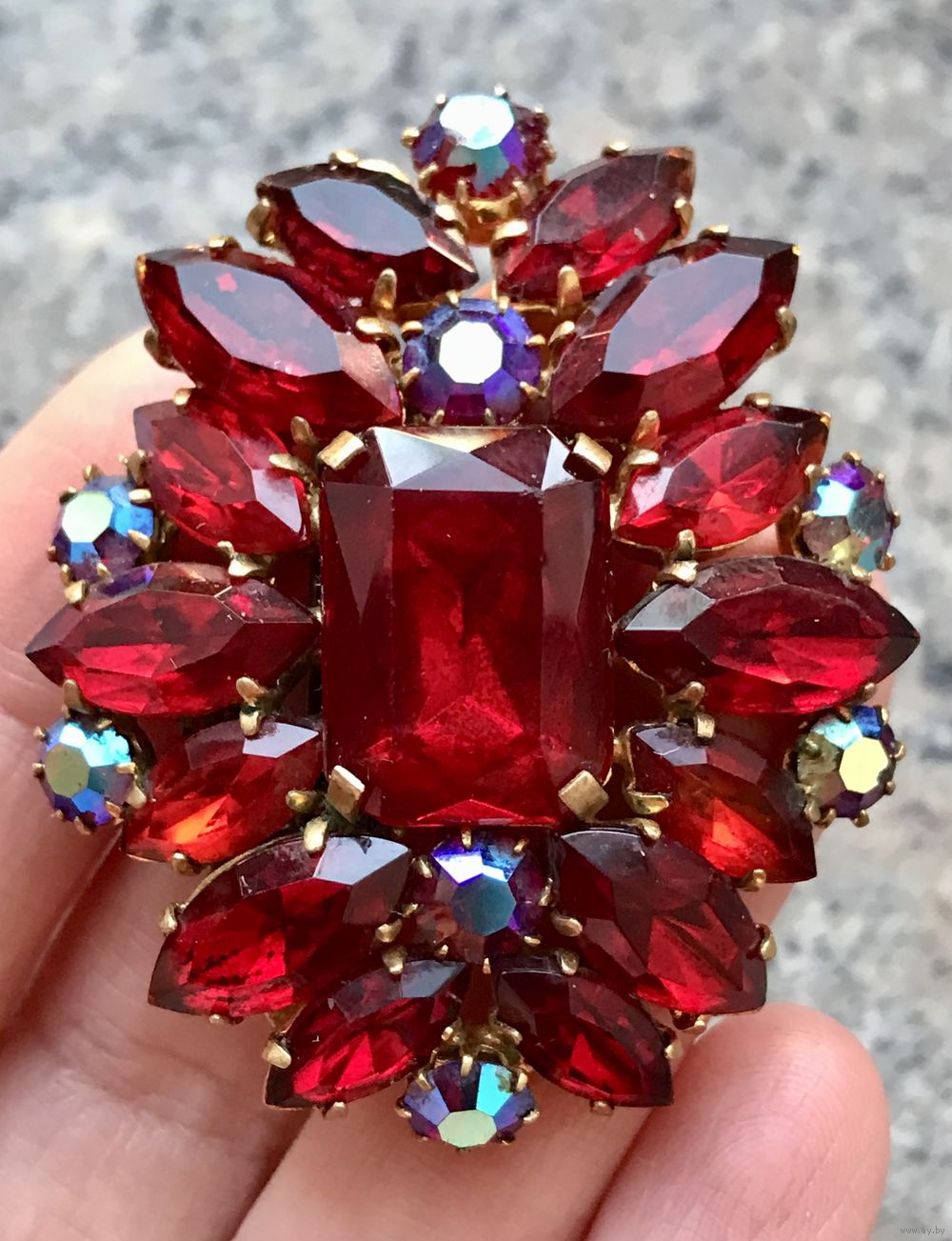 Чешская брошь с основой из латуни с позолотой и вставок из цветного стекла и стекла с покрытием AB. На нескольких вставках есть небольшие скольчики (учтено в цене). Размер броши 5х4см.