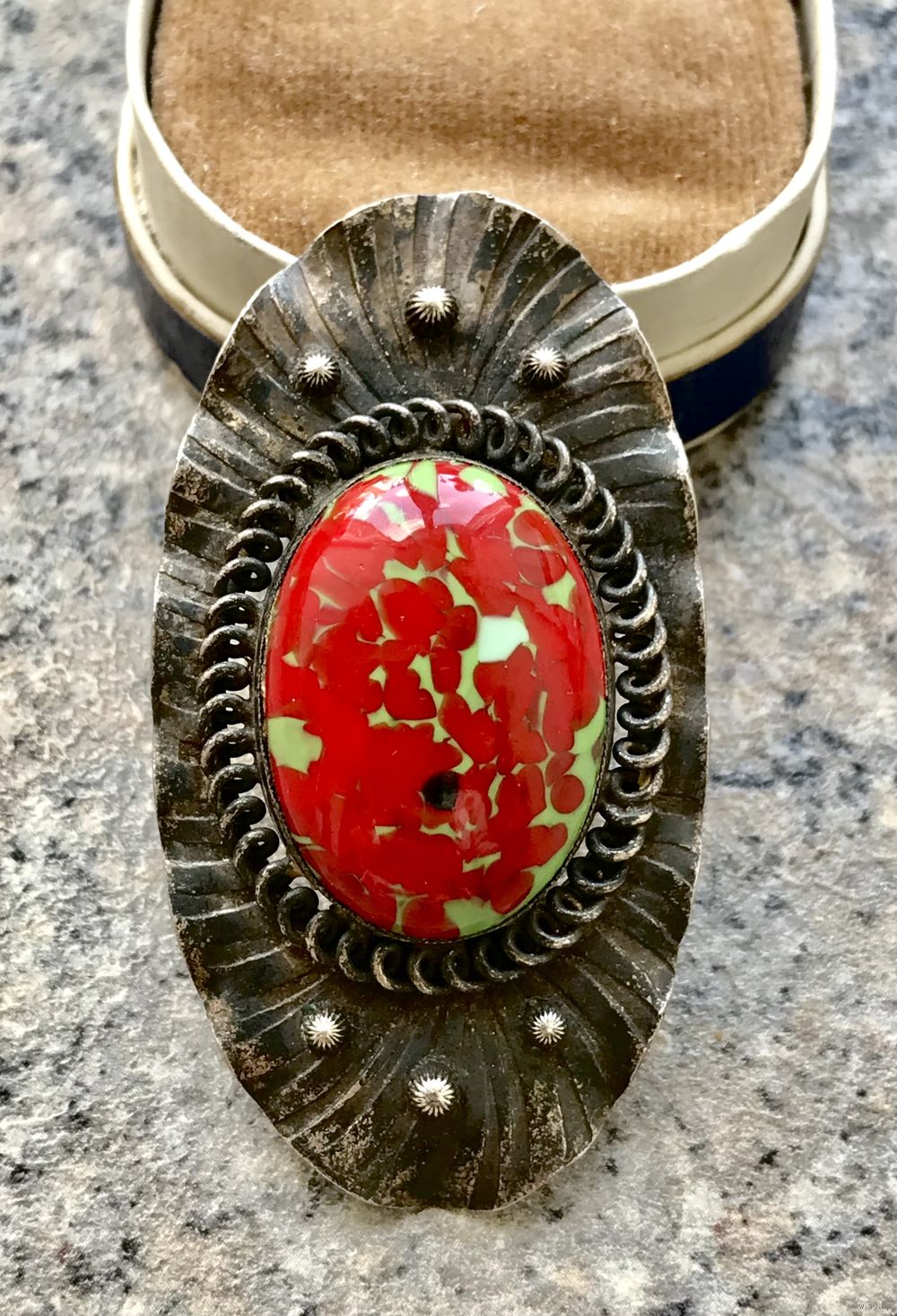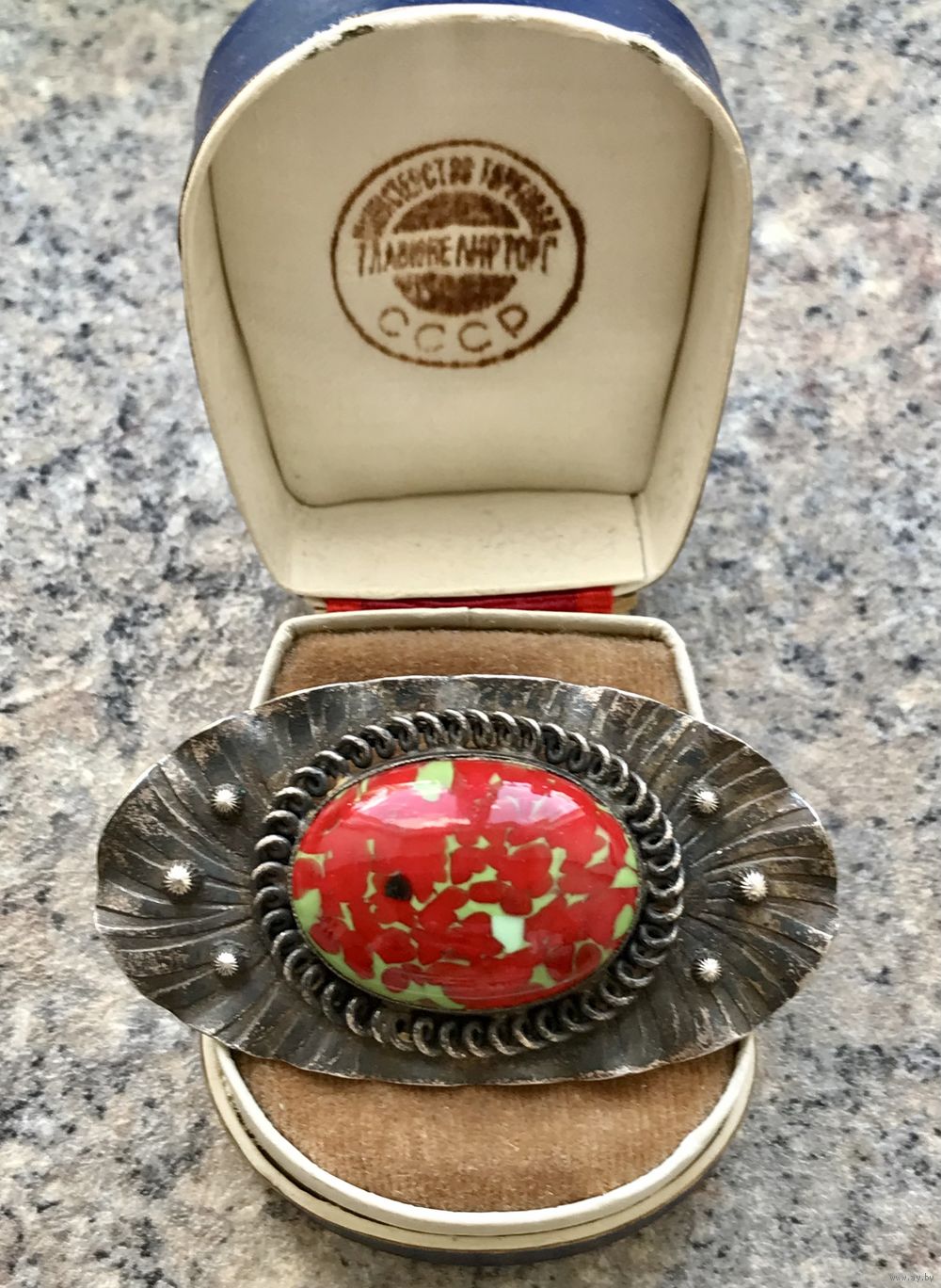 Винтажная брошь с основой из металла серебристого тона и вставки из художественного стекла. Размер броши 5,5х3см., размер вставки 2,3х1,6см. Состояние хорошее.