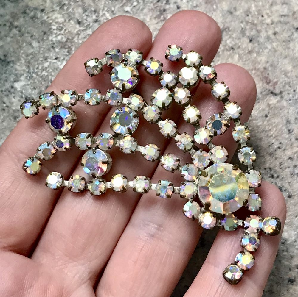 Крупная брошь с основой из латуни с серебрением и вставок из стекла с покрытием AB. С обратной стороны на металле имеются потёртости покрытия. Размер броши 6,5х5см.