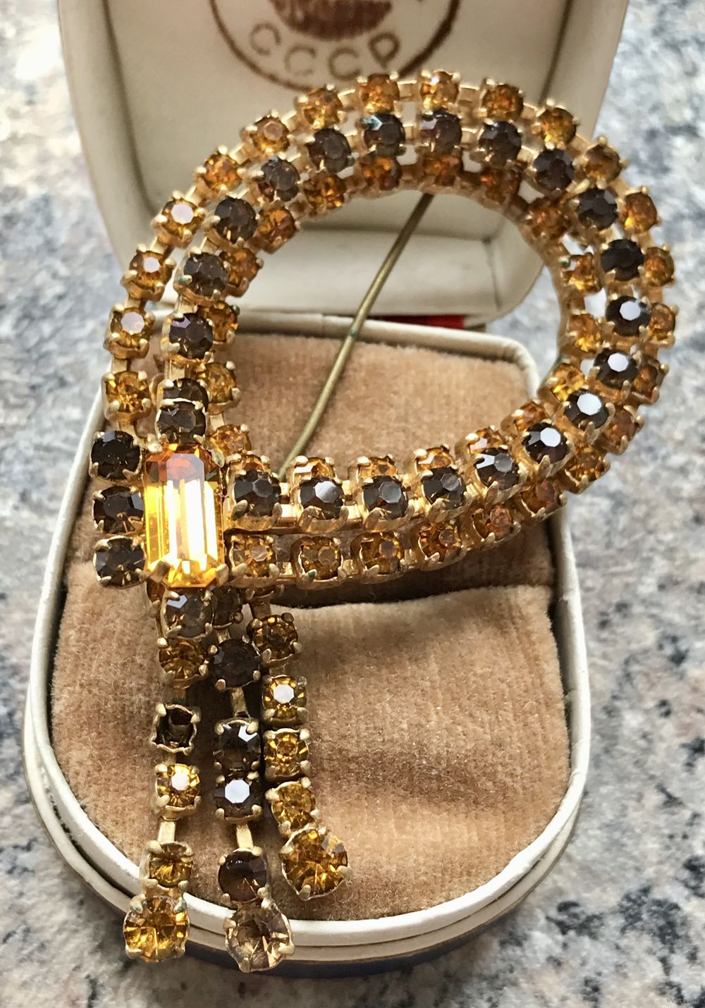 Винтажная чешская крупная брошь. Высота 7см. Не хватает одной вставки на висюльке и нет фиксатора на застёжке. Все нюансы учтены в цене.