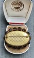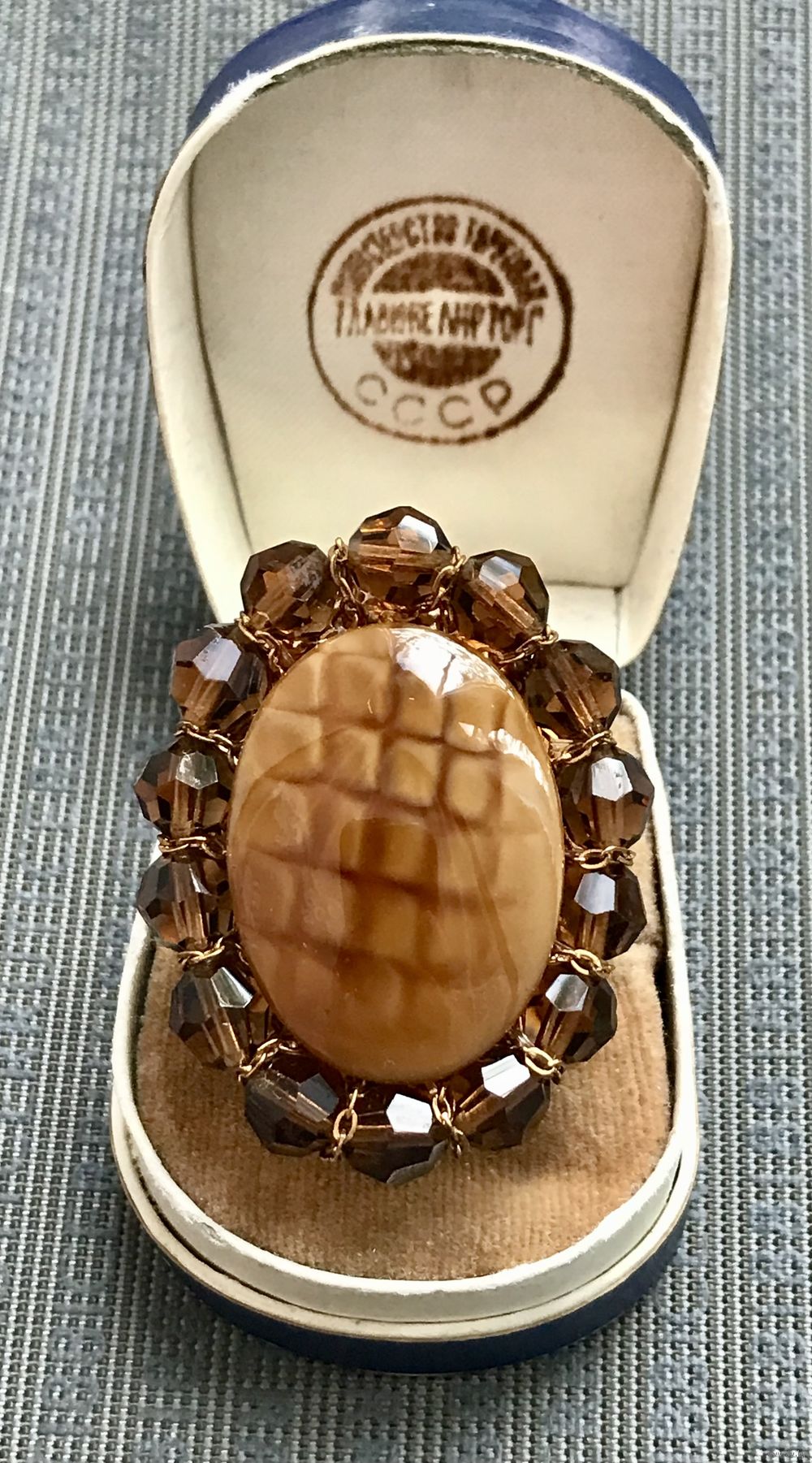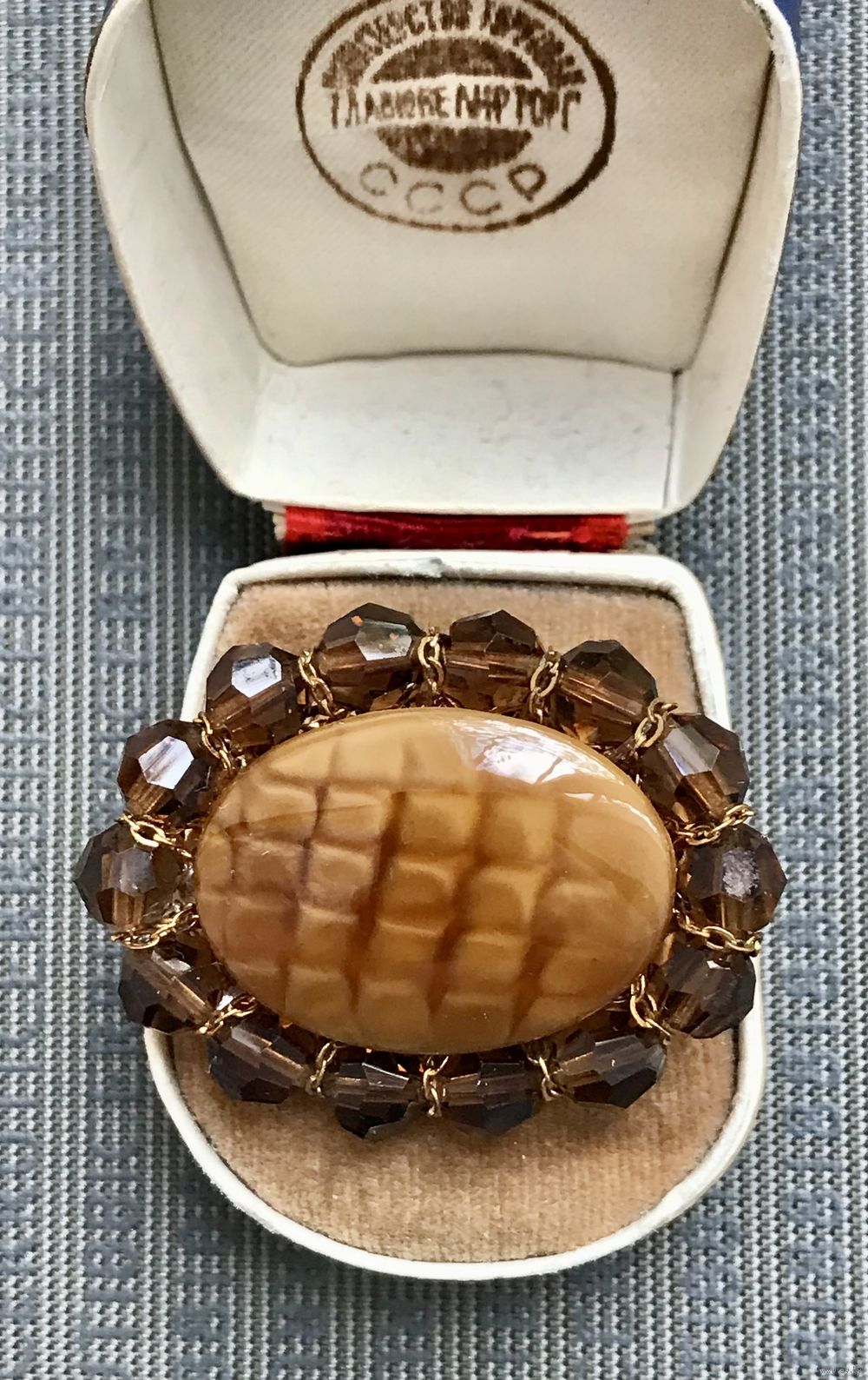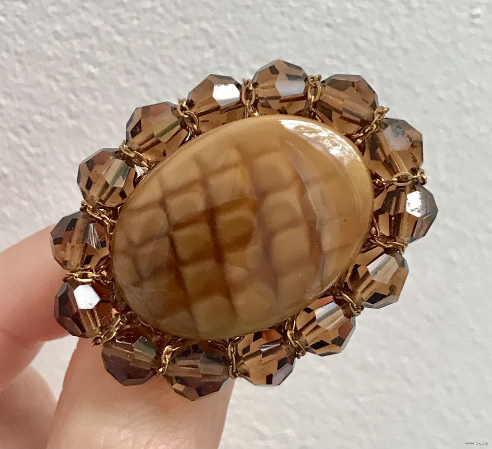Винтажная чешская наборная брошь. Основа выполнена из латуни, лицевая сторона украшена стеклянными бусинами и художественным стеклом. Размер 4,4х3,4см. Немного подвижна основа. Общее состояние хорошее.