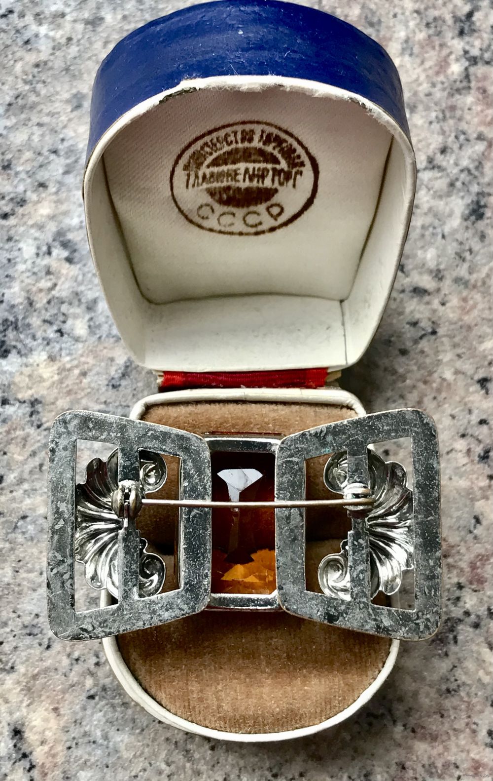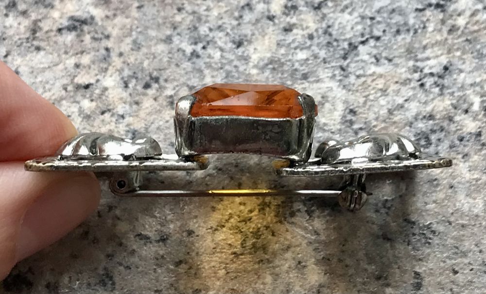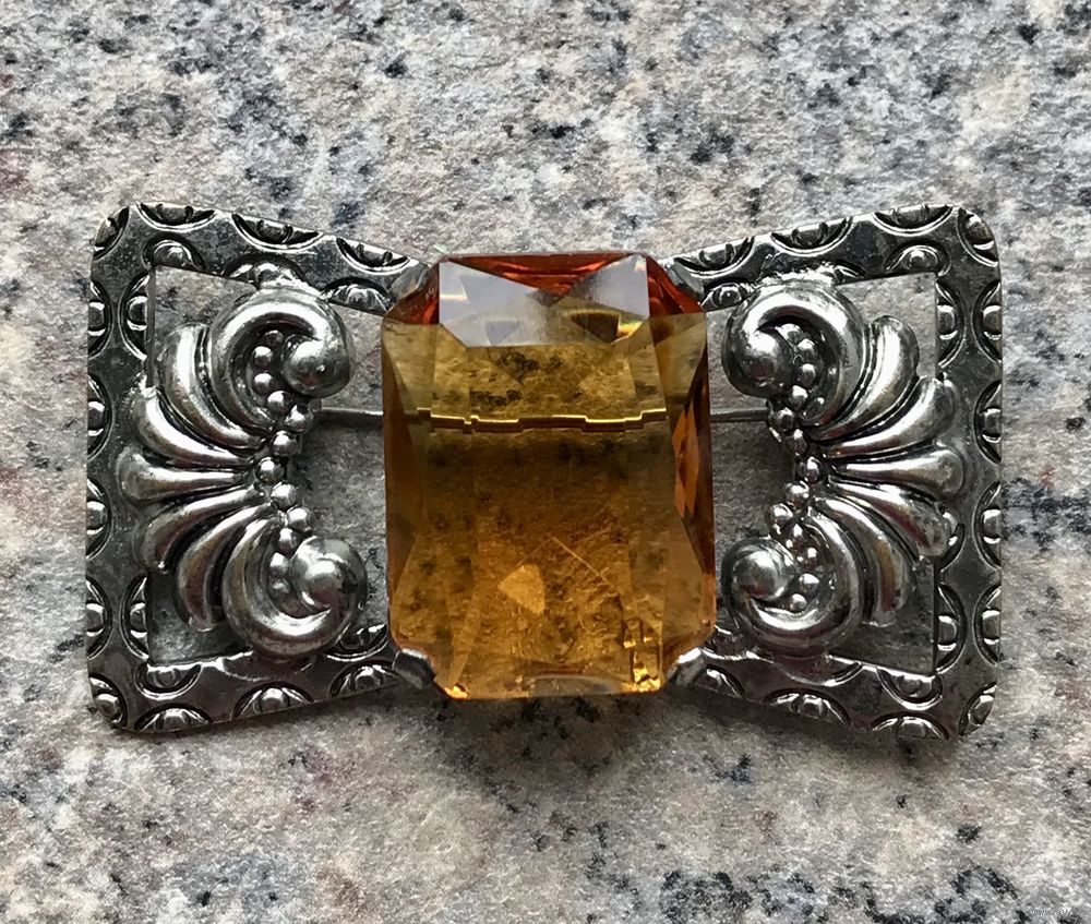 Крупная винтажная чешская брошь со вставкой из стекла. Размер броши 5х3см., размер вставки 2,5х1,8см. (имеется незначительный скольчик. Общее состояние хорошее.