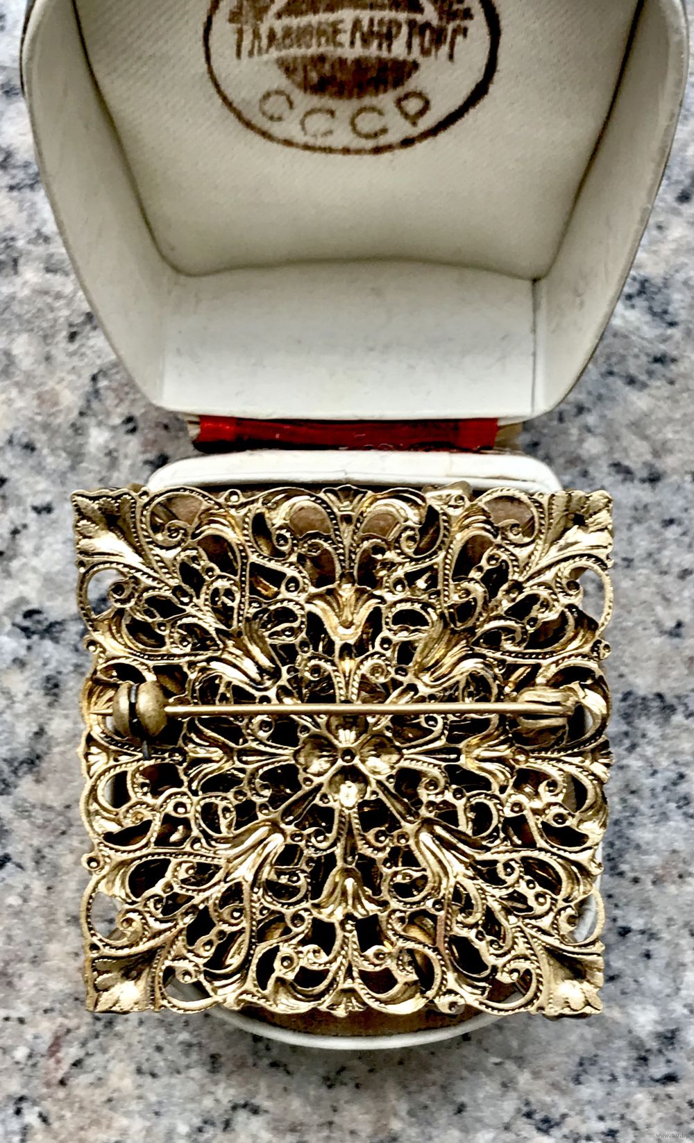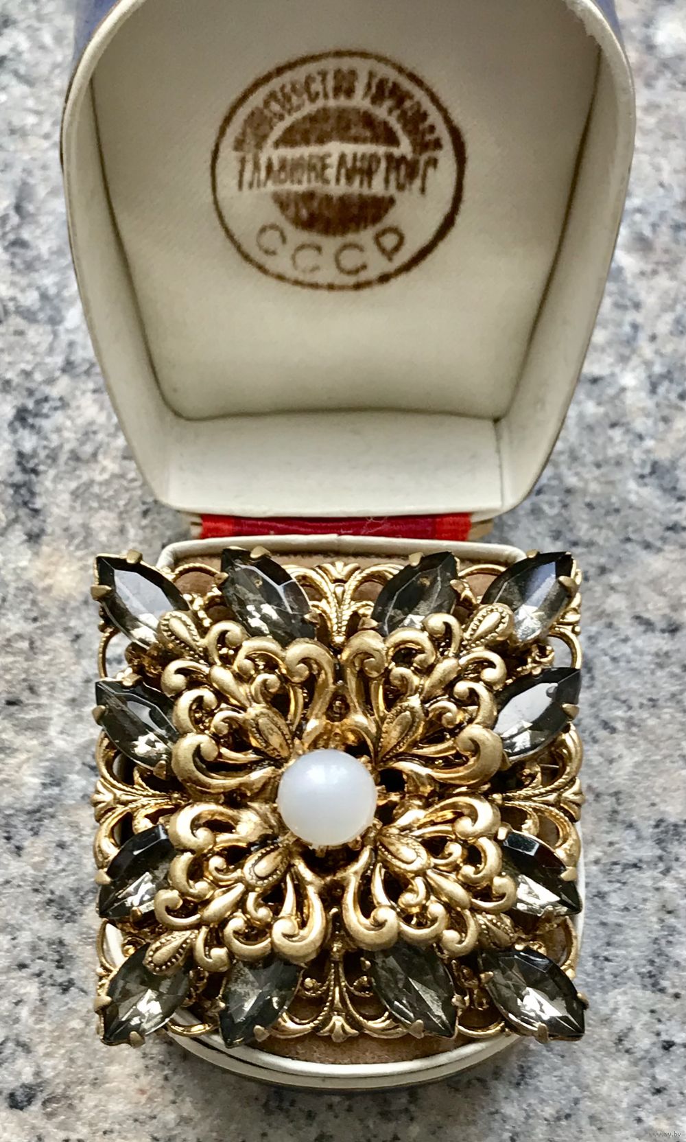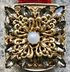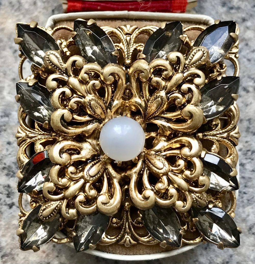 Крупная винтажная чешская брошь со вставками из стекла (на центральной вставке под жемчужину сход перламутрового покрытия). Размер броши 4х4см. Общее состояние хорошее.