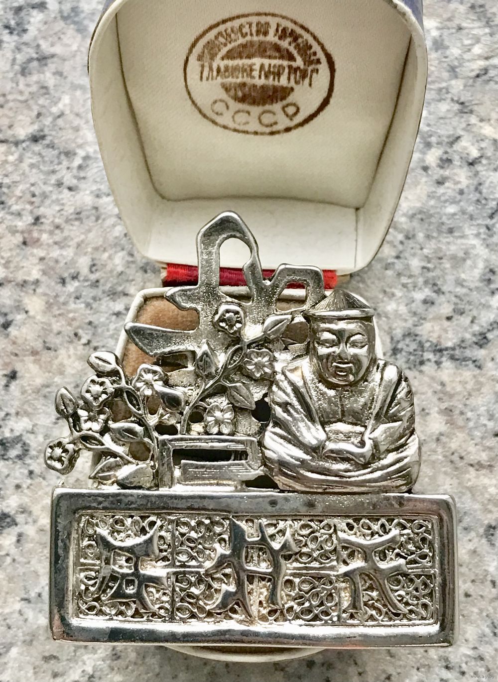 Крупная брошь в виде китайского божества. Мне кажется, это мудрец Чен Лобань (хранитель денег). Размер броши 5,5х5,2см. Тяжёленькая. Состояние хорошее.