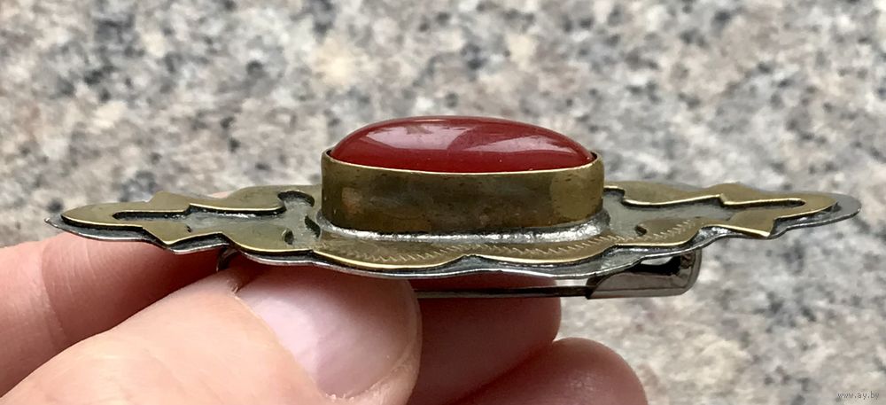 Туркменская брошь с основой из металла и вставкой из плотного пластика под сердолик. Размер 6,5х2см. Состояние хорошее.