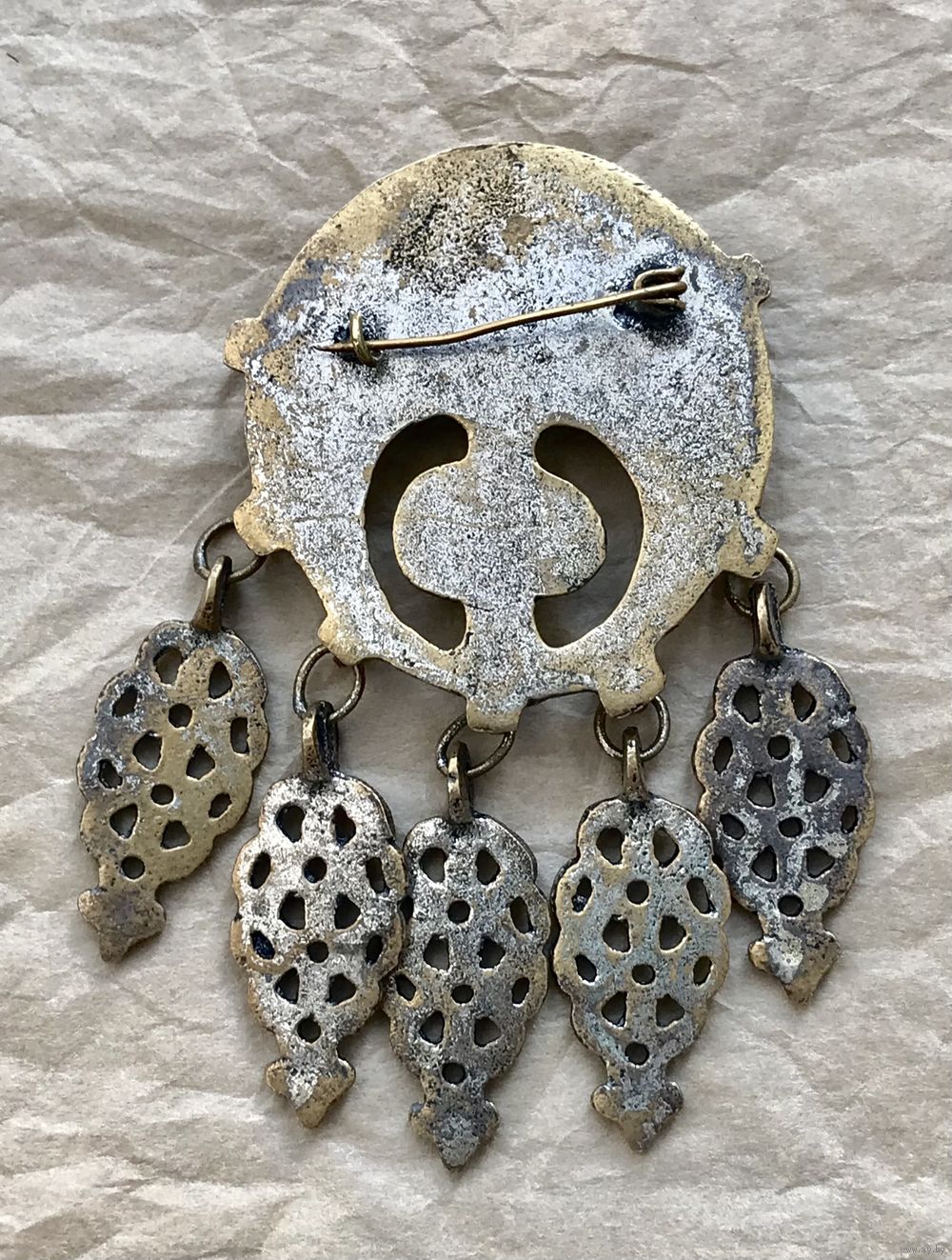 Крупная винтажная брошь в этническом стиле из металла похожего на бронзу с серебристым покрытием.Рубиновая вставка из пластика. Брошь имеет болгарское происхождение. Размер броши 8х4см. На металле имеются потёртости. Тяжёленькая. Состояние хорошее.