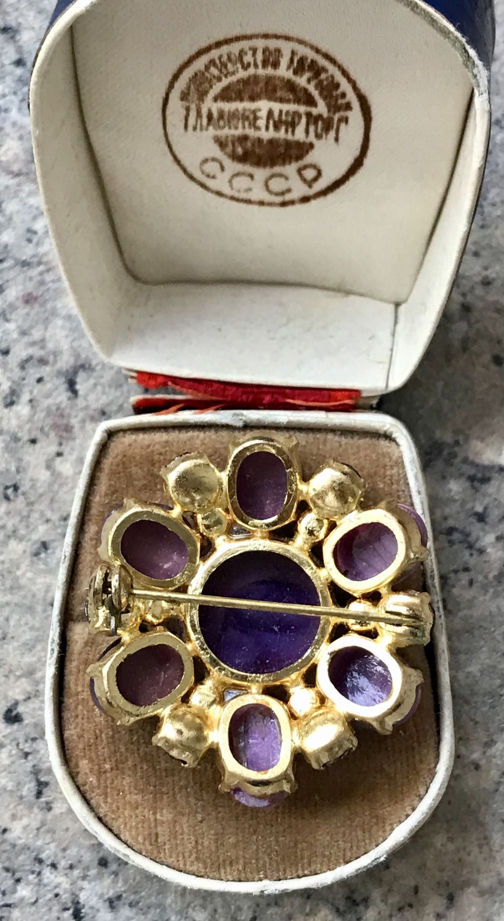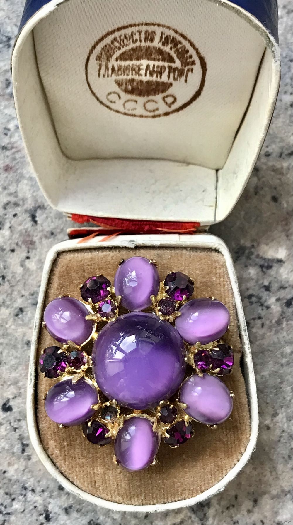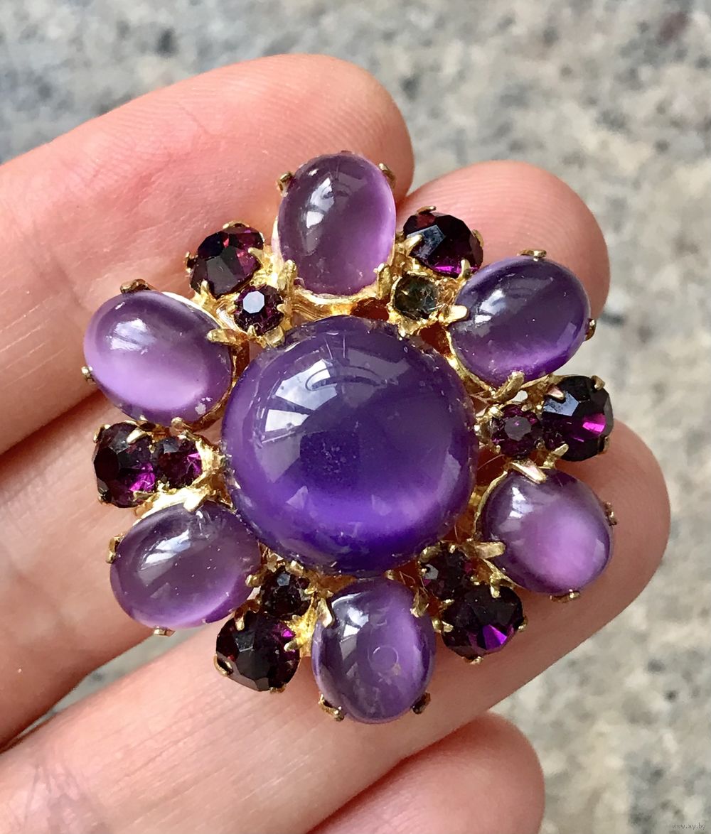 Винтажная чешская брошь с основой из латуни и вставками из художественного стекла и кристаллов (не хватает одного мелкого кристаллика и есть небольшой скол на одной вставке из стекла). Диаметр броши 3,7см. Все нюансы учтены в цене.