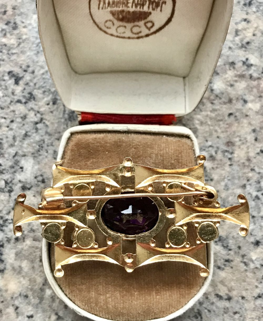 Крупная брошь с основой из латуни с позолотой и вставками из стекла. Изготовлена в Приволжске (70-80-е гг.). Размер броши 5,3х2,5см., размер центральной вставки 1,6х1,2см. На металле в нескольких местах имеются незначительные потемнения, на вставках незначительные скольчики. Общее состояние хорошее. Редкая модель.