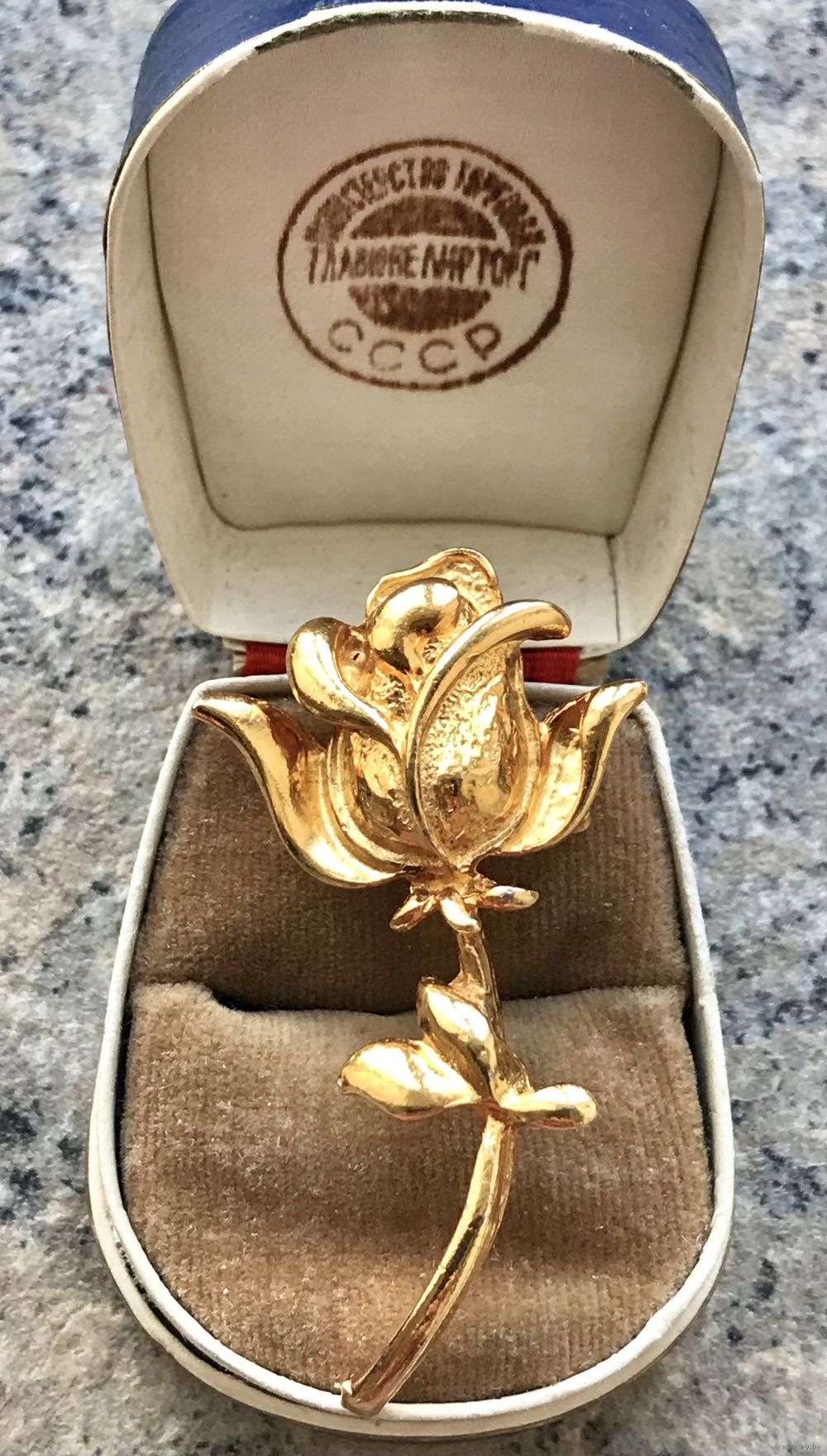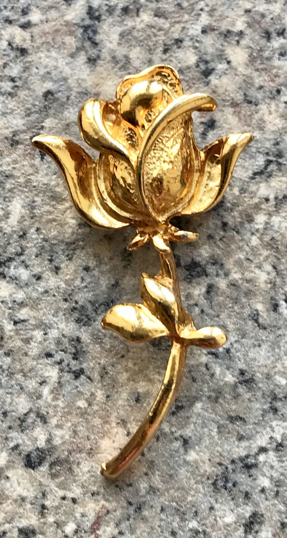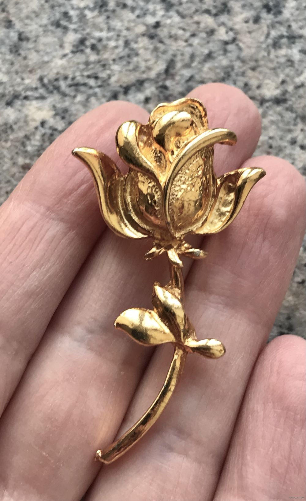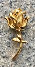 Винтажная брошь с основой из металла золотого тона. Германия. Высота 5,5см., размер бутона 2,5х3см. В нескольких местах есть незначительные потёртости позолоты. Общее состояние украшения хорошее.