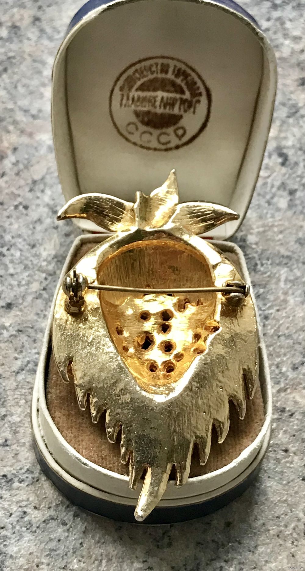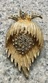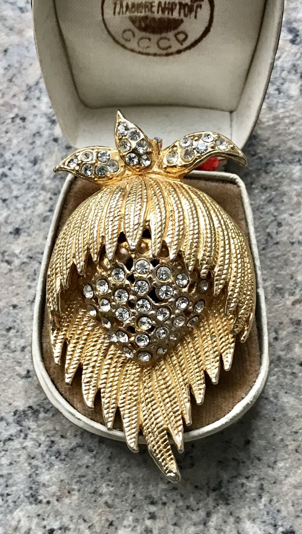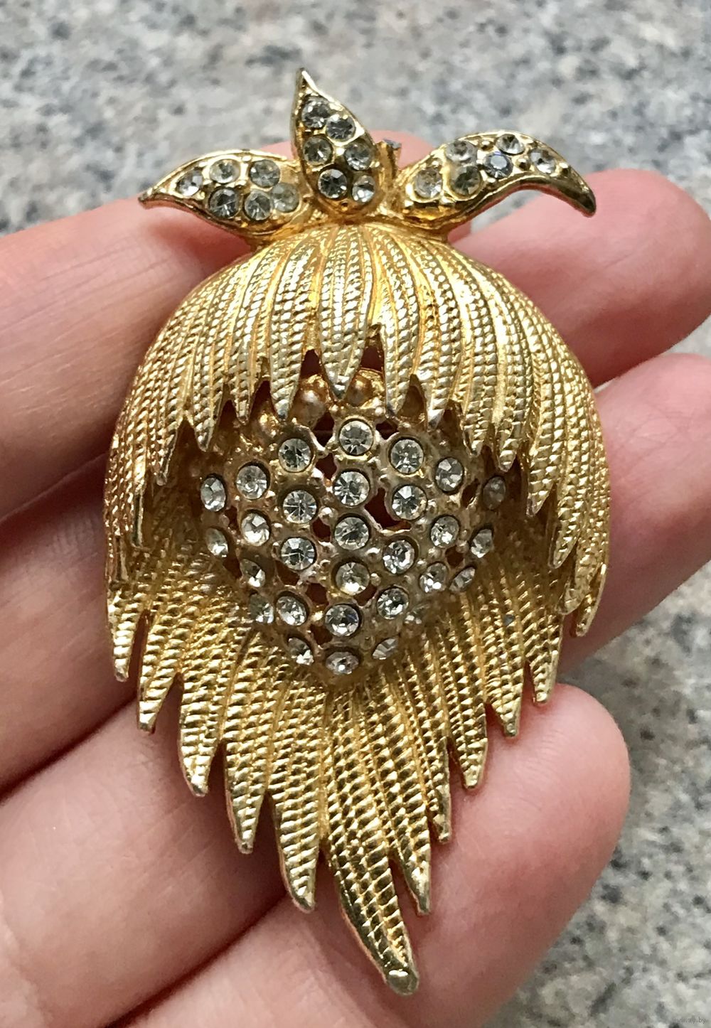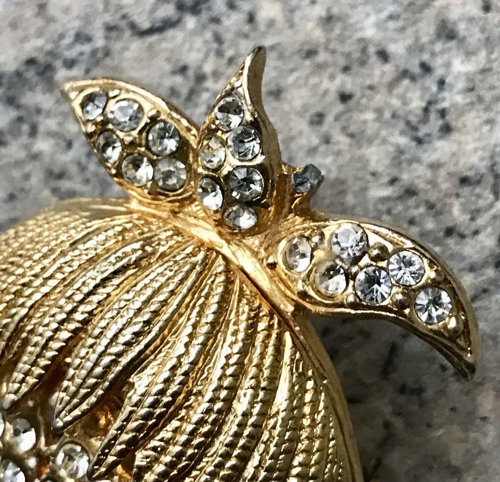 Чешская брошь из 70-х гг. Основа выполнена из металла золотого тона, лицевая сторона украшена прозрачными кристаллами. На броши сверху не хватает хвостика (этот момент учтён в цене). Размер 6,5х3,5см.