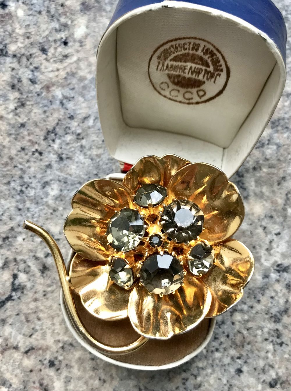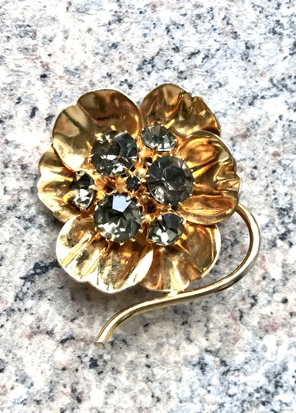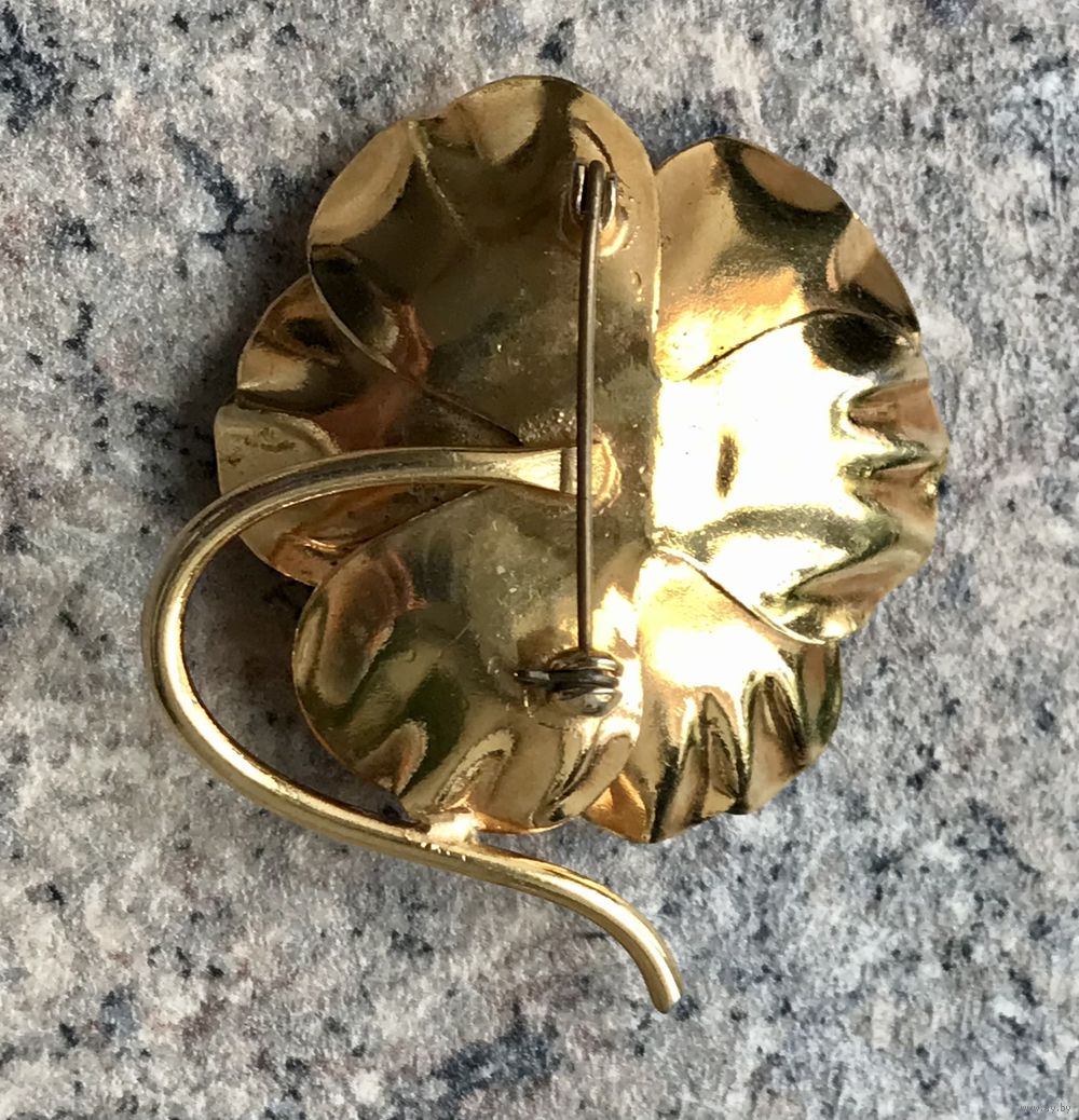 Винтажная (1970-е г.) крупная брошь со вставками из чешского стекла дымчатого цвета, размер 5х4 см., имеются незначительные потертости на металле. Общее состояние броши хорошее.