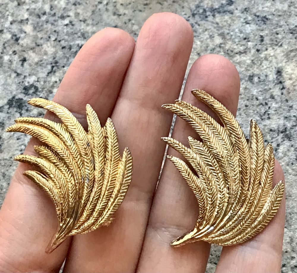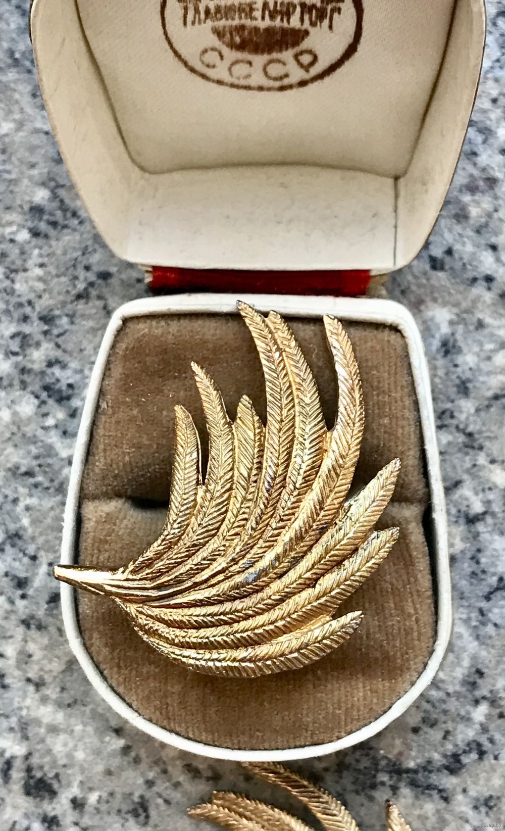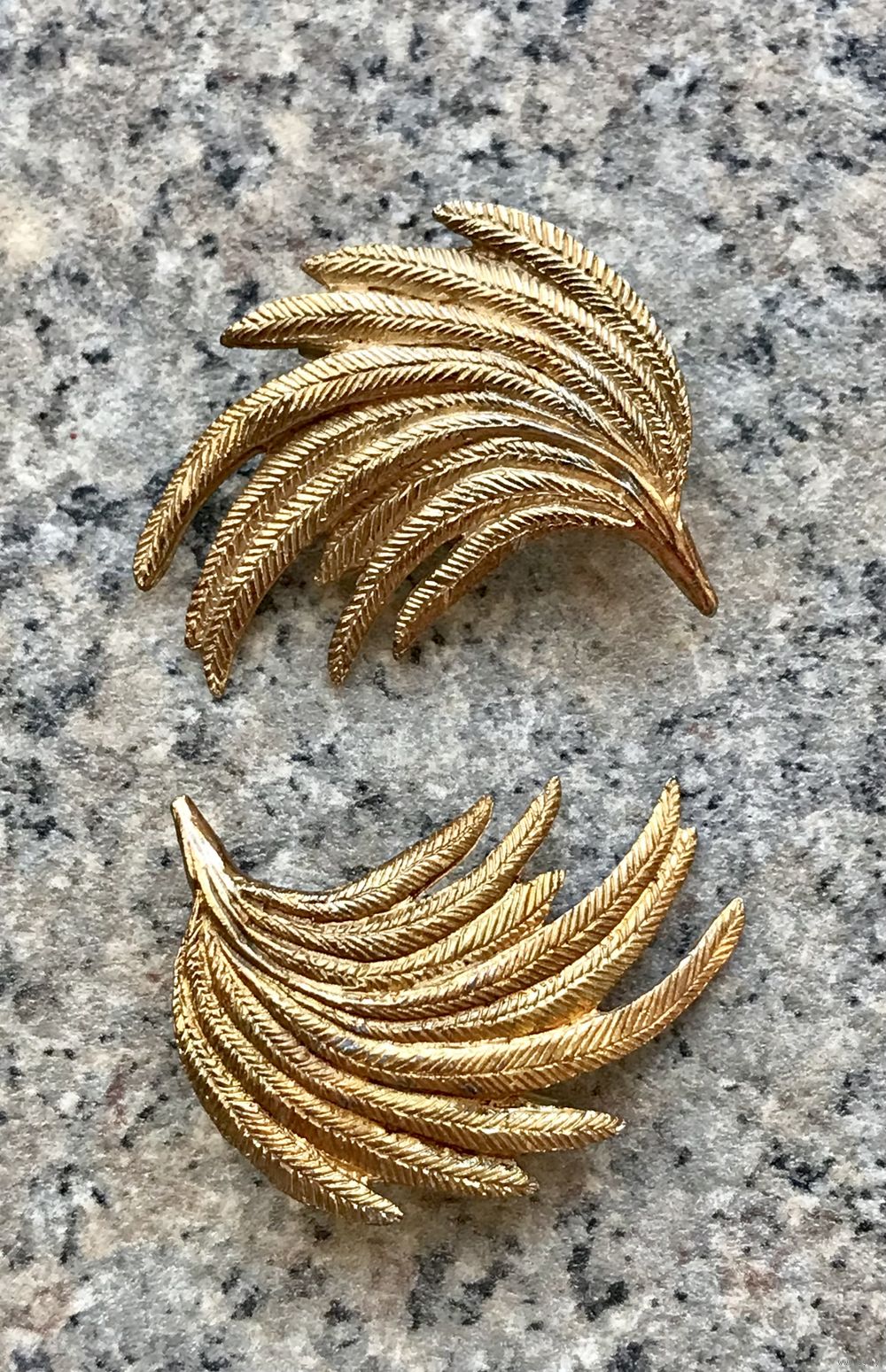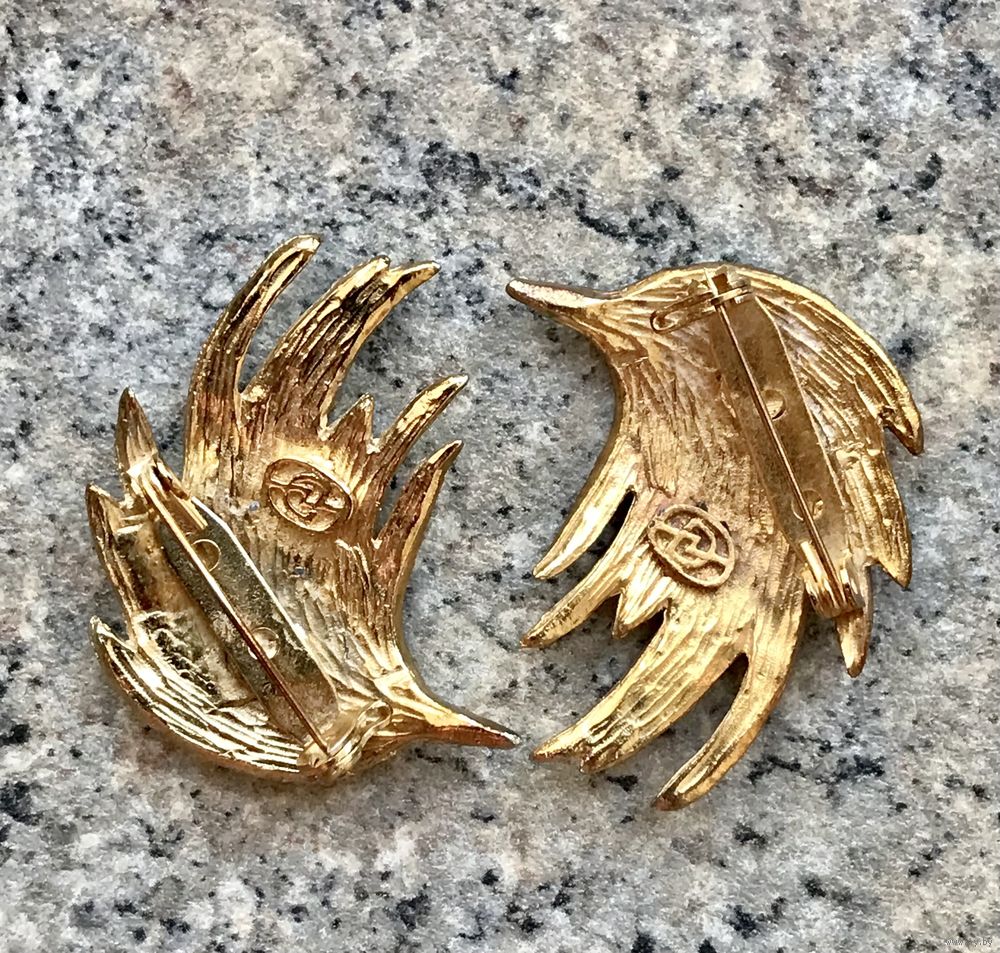 Винтажные броши из металла золотистого тона (на металле местами имеются небольшие потёртости). Размер каждой 4х2,5см. Немного отличаются по цвету. Маркированы. Можно носить как парные. Цена указана за одну.