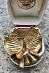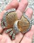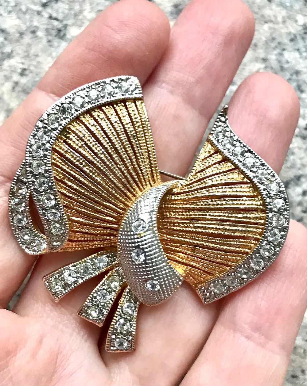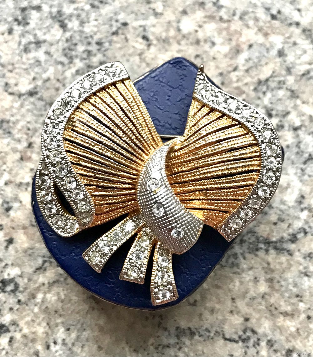 Крупная эффектная брошь с основой из металла золотистого тона, вставки кристаллы. Размер броши 5х5см. Местами имеются незначительные потёртости позолоты. Тяжёленькая. Общее состояние хорошее.
