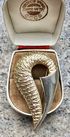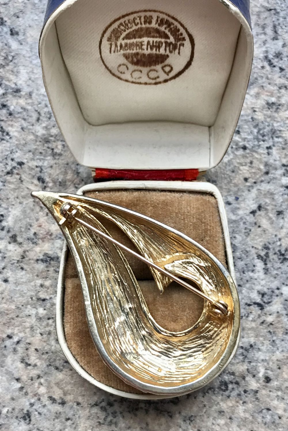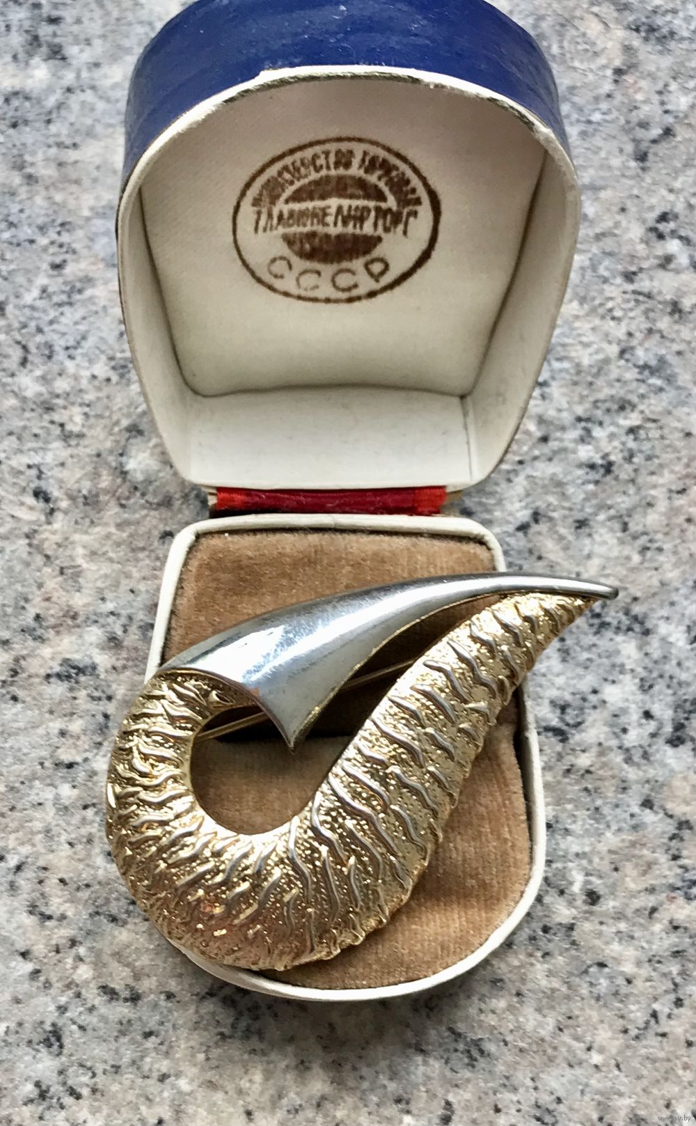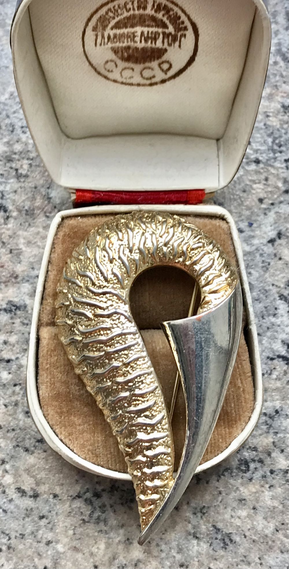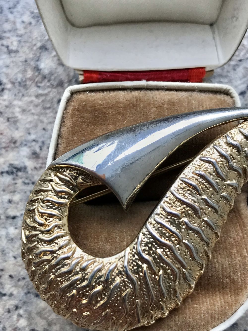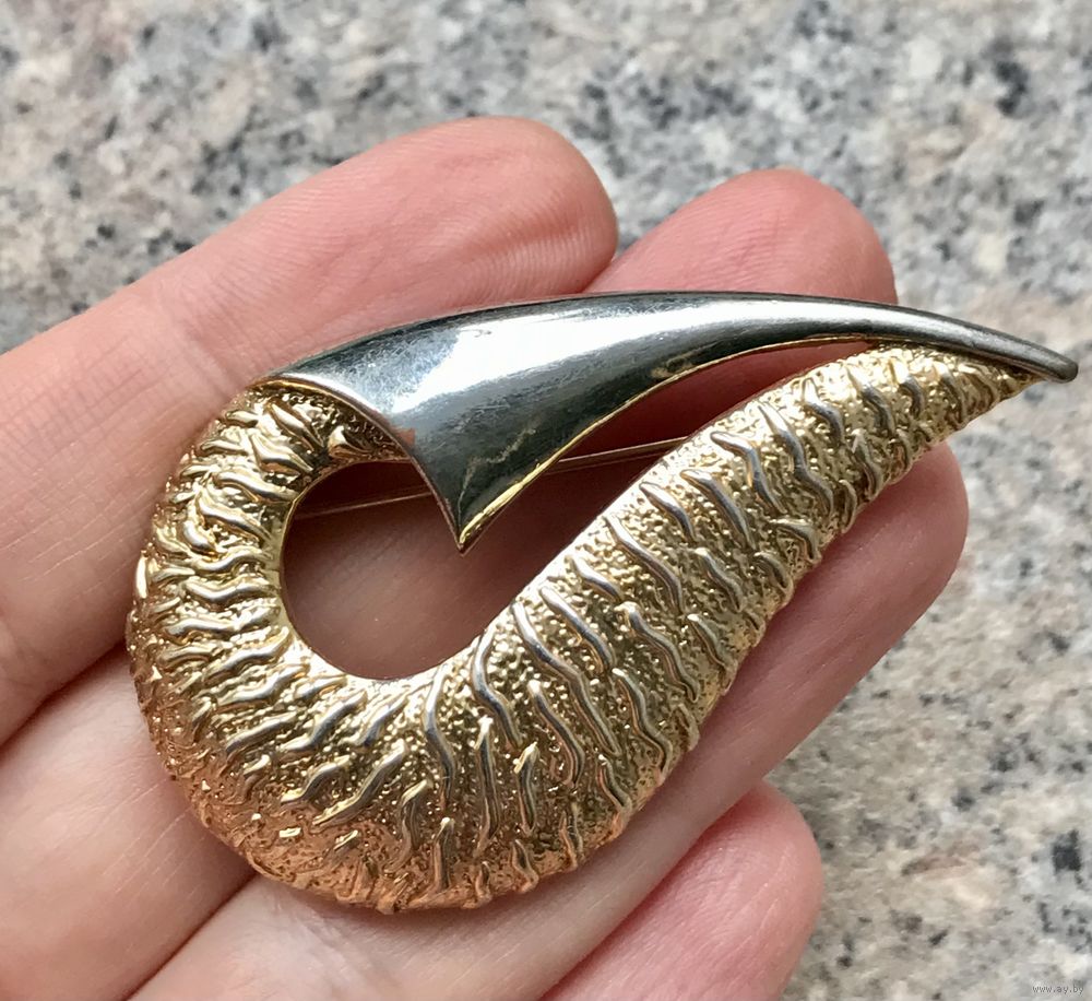 Крупная винтажная брошь из сплава двух тонов. На лицевой стороне в одном месте небольшая потертость. Размер броши 5,6х3,3см. Общее состояние хорошее.