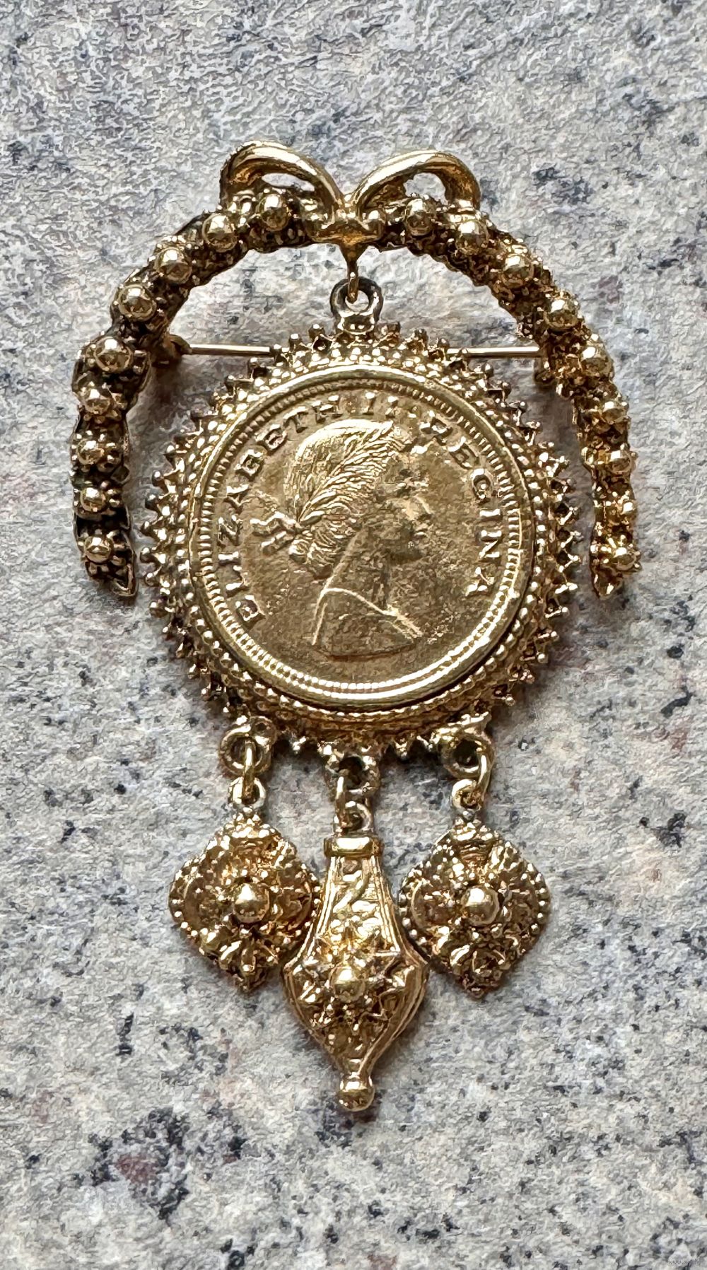 Крупная винтажная брошь с изображением Королевы Елизаветы II. Брошь сделана из металла золотого тона. Размер 8х5см. Состояние хорошее.