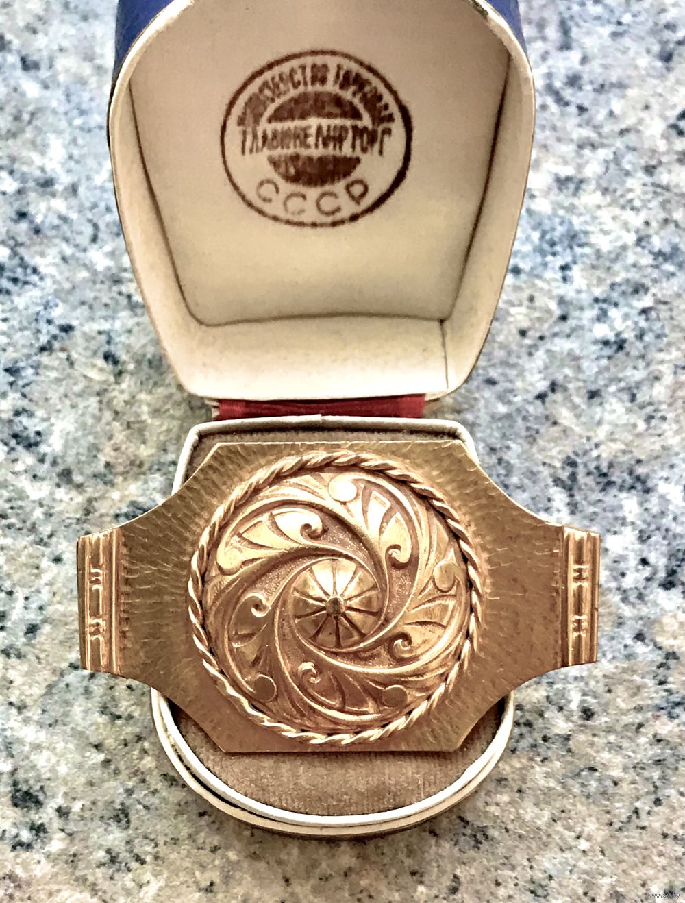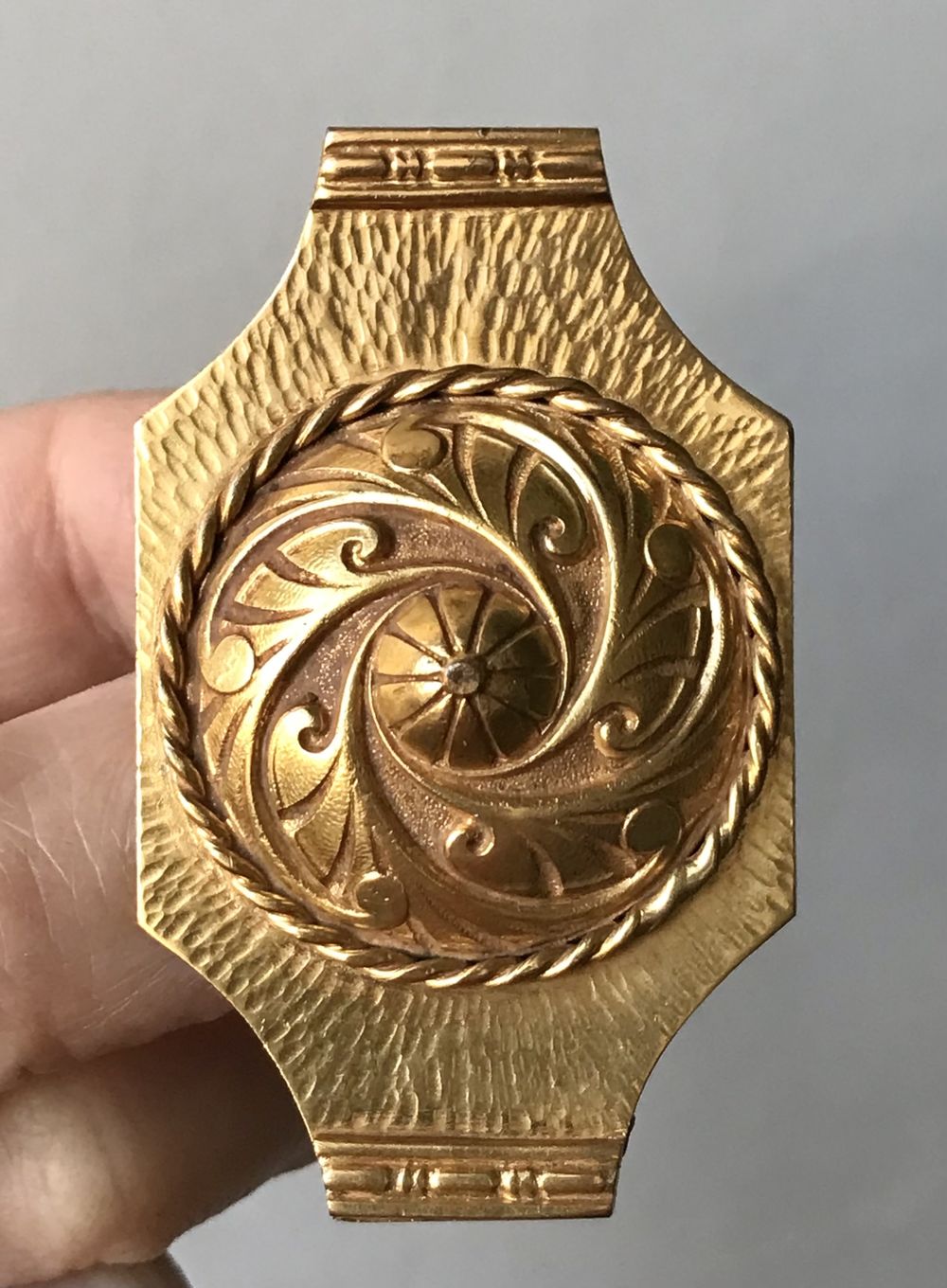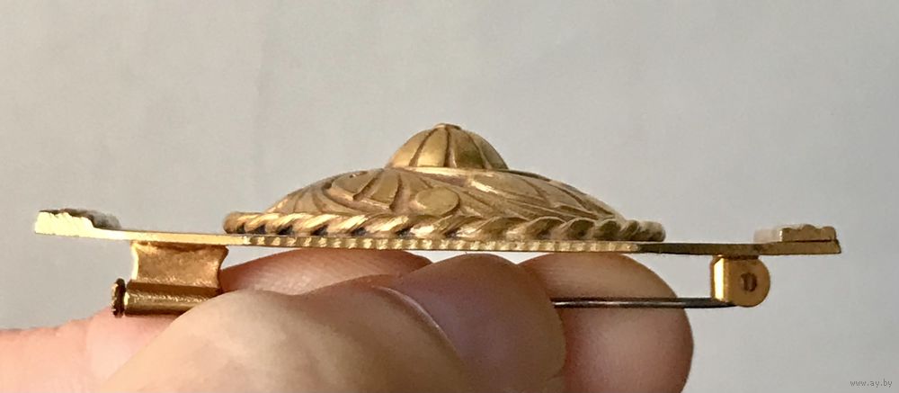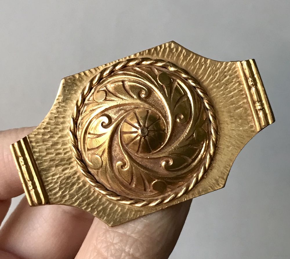 Крупная антикварная брошь из Франции. Изготовлена из металла золотистого тона. Размер 5,8х3,5см. Застёжка тромбон. Достаточно увесистая. Состояние хорошее.